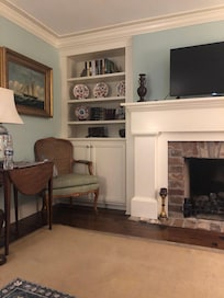 Enter below the main townhome staircase and step into the small, yet spacious apartment. Walk through the foyer to a comfortable living space featuring an original masonry fireplace, custom built-ins, and original hardwood floors. We have a new pull-out couch for 2 as well. Just off the living space, find a small den with a designated workspace, along with high-speed Wi-Fi this apartment is perfect for the remote worker.