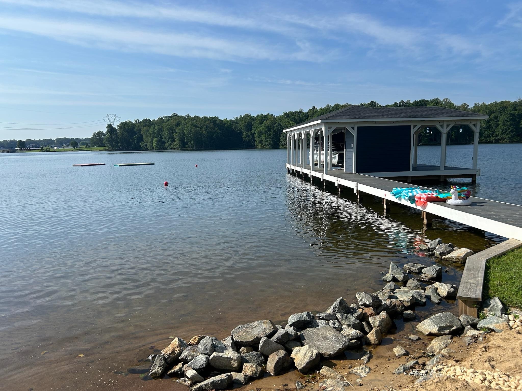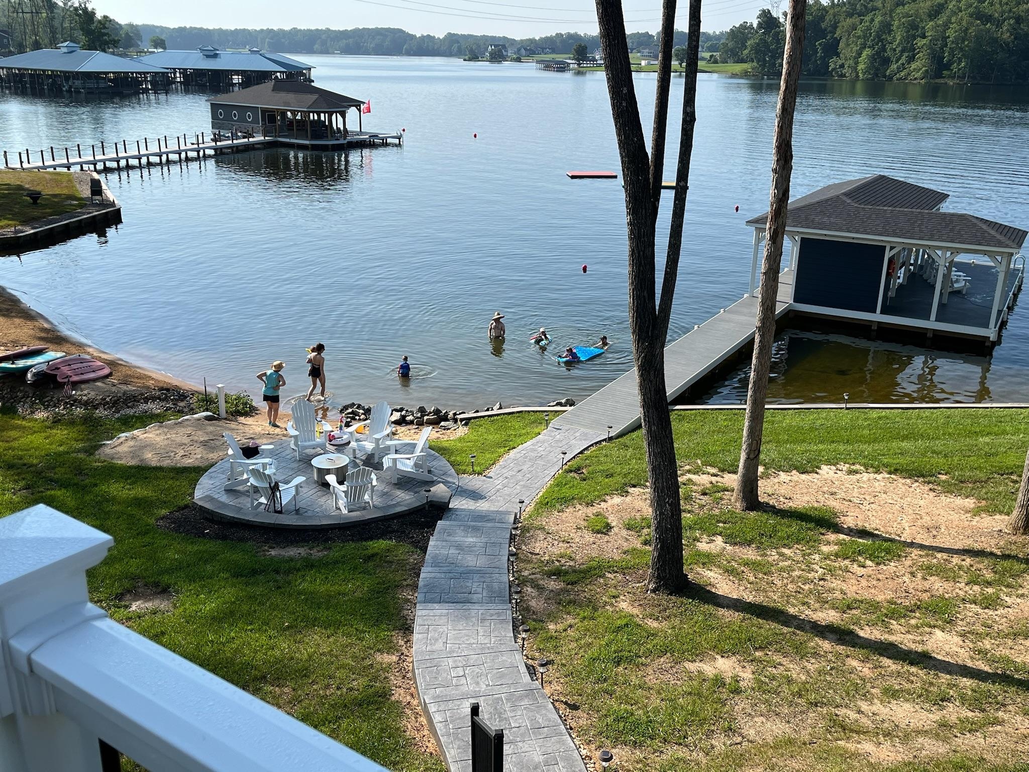 This home is virtually brand new and everything about it was immaculate -- open living/dining/kitchen area was perfect for a large group with room for 12 at the dining table, plus an additional screened porch and deck for eating, using our laptops with the excellent WIFI, or quietly reading. The bedrooms were all comfortable and nicely decorated and the 4 bathrooms very handy. The lake surprised us -- water temperature was some 80 degrees, and felt like a relaxing, warm bath. The kids loved all the noodles, floats, kayaks, and paddle boards (plus the sand box for the little ones), and there were plenty of life vests of all sizes for everyone. Most of our time was spent in the water or floating on it, although we also enjoyed the board games, fussball, shuffleboard, and corn hole. The ladies in our group walked nearly 3 miles each day along the community roads and found friendly neighbors who pointed out the blackberries for us. Although we stayed close to home most of the time, we enjoyed the mini golf and ice cream spot with arcade that the owner recommended. All in all, a great vacation with everything we could ask for. - Mary (July 2023)
