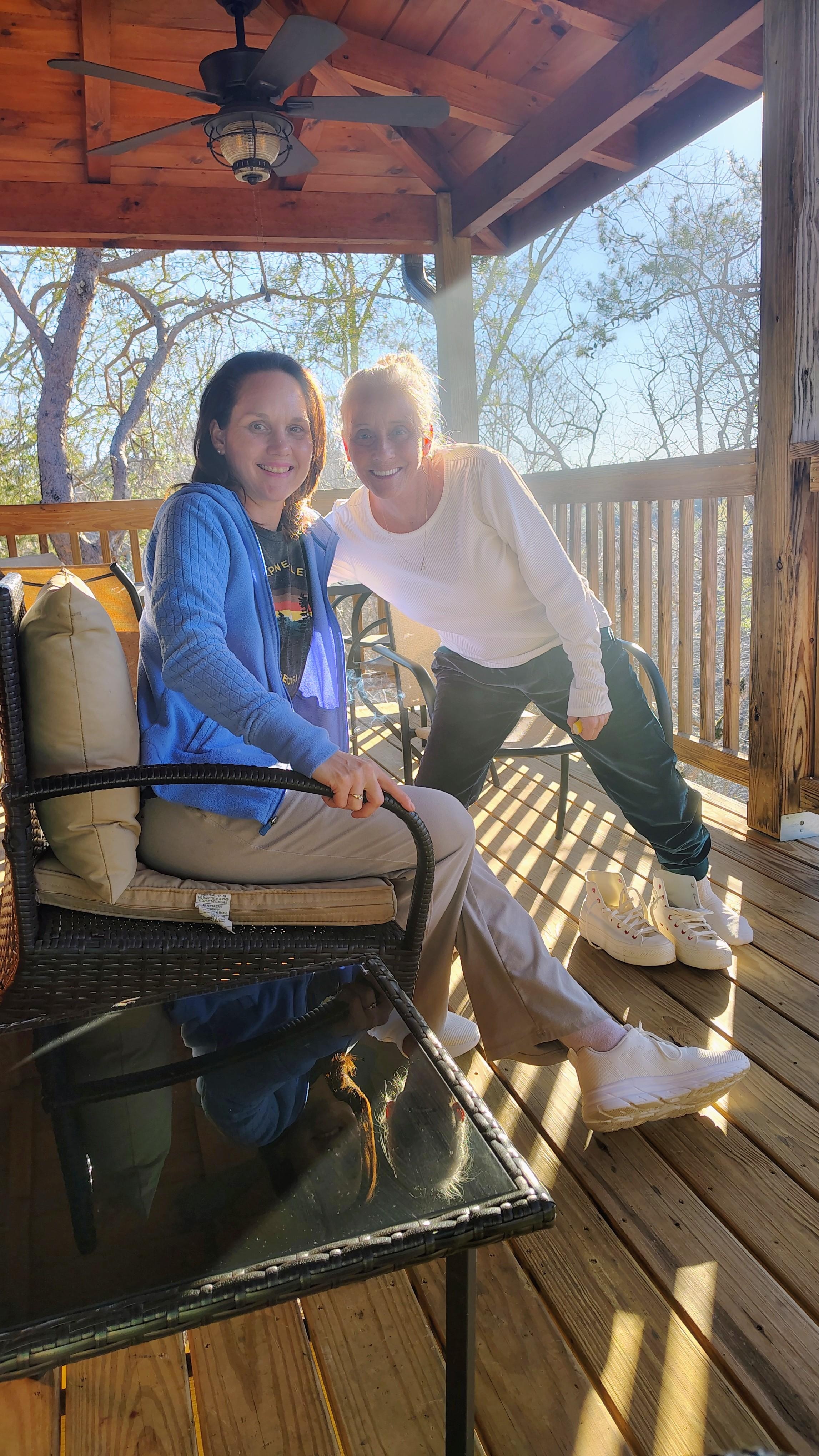 Covered balcony with multiple lounge areas
