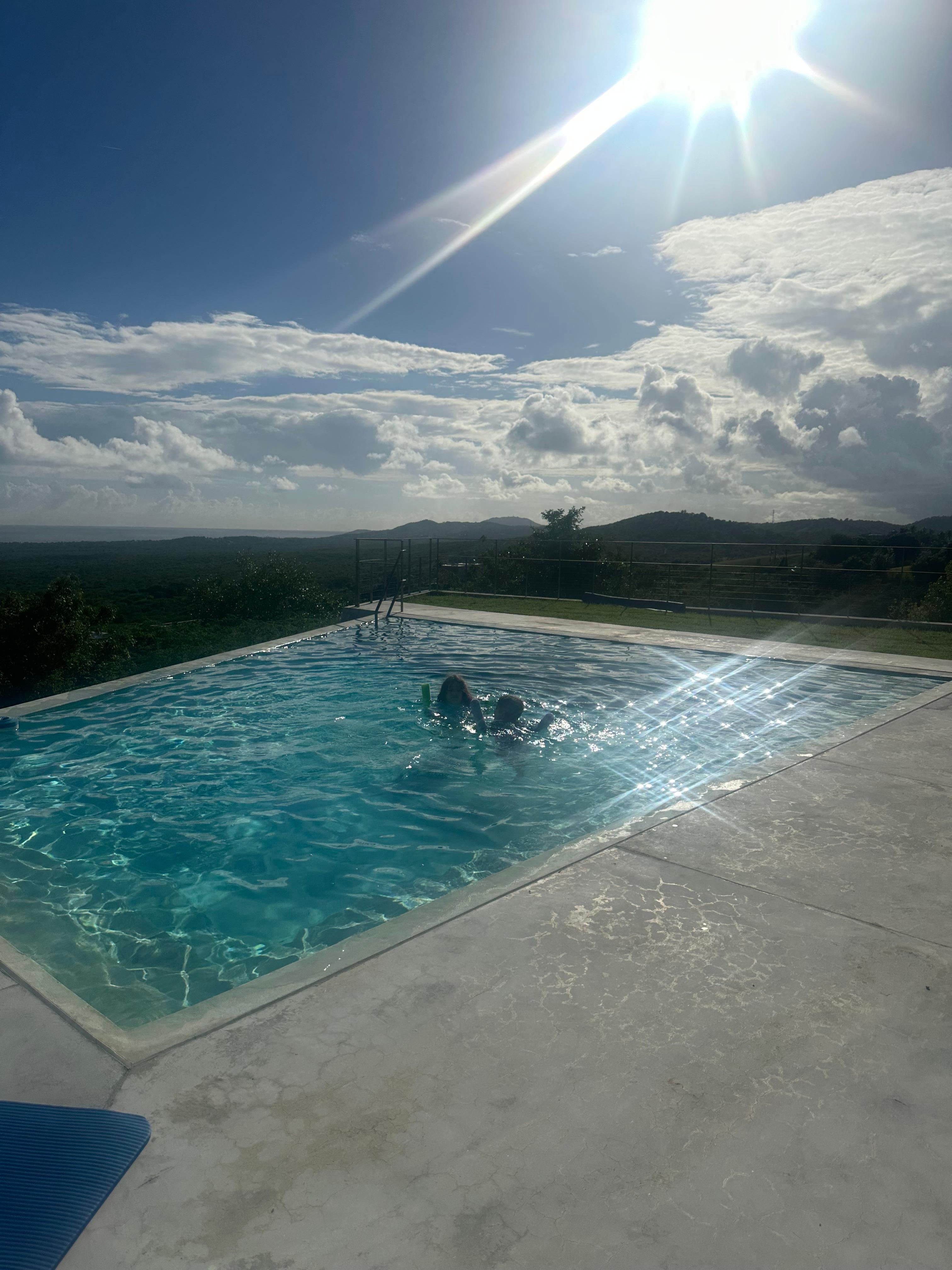 Upstairs, three bedrooms open to a shared terrace that provides a birdseye view of the pool below and Caribbean sea beyond. Each bedroom is equiped with a state of the art fan and AC system. Crisp cotton sheets, soft bath towels, and floor to ceiling sliding glass doors with airy drapes guarantee a peaceful respite anytime of day or night. The master bedroom has 180 degree views, an en-suite bathroom with rainshower, luxurious king size bed, and private terrace nook to enjoy your morning coffee or sunset cocktail. The second bedroom, designed for kids or single guests, has a twin-full-trundle bunk bed. The third bedroom can be arranged with two twin beds or a comfortable king-size bed to accommodate single guests / kids or a couple. A second full bathroom with rainshower completes the second floor.