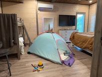 *Make yourself at home in this newly constructed two-story cabin. It has two bedrooms and 2.5 bathrooms, sleeps up to eight guests (six adults, two children). On our main/entry level as you walk in you can enjoy the family room, full kitchen w/ dining area and double-sided fireplace, also covered patio with dining area and BBQ. Smart TV and high-speed Wi-Fi. The master ensuite w/ access to the spacious deck with outdoor seating and hot tub with amazing views. On the second level you'll find one queen bed, queen sleeper sofa and bunk beds for kids. The queen bed and bunk beds are in a room, but the room is not completely enclosed. Full bath and laundry room with stackable washer and dryer. There are two Smart TVs, pool table, board games for the whole family and more outdoor seating on our spacious deck.