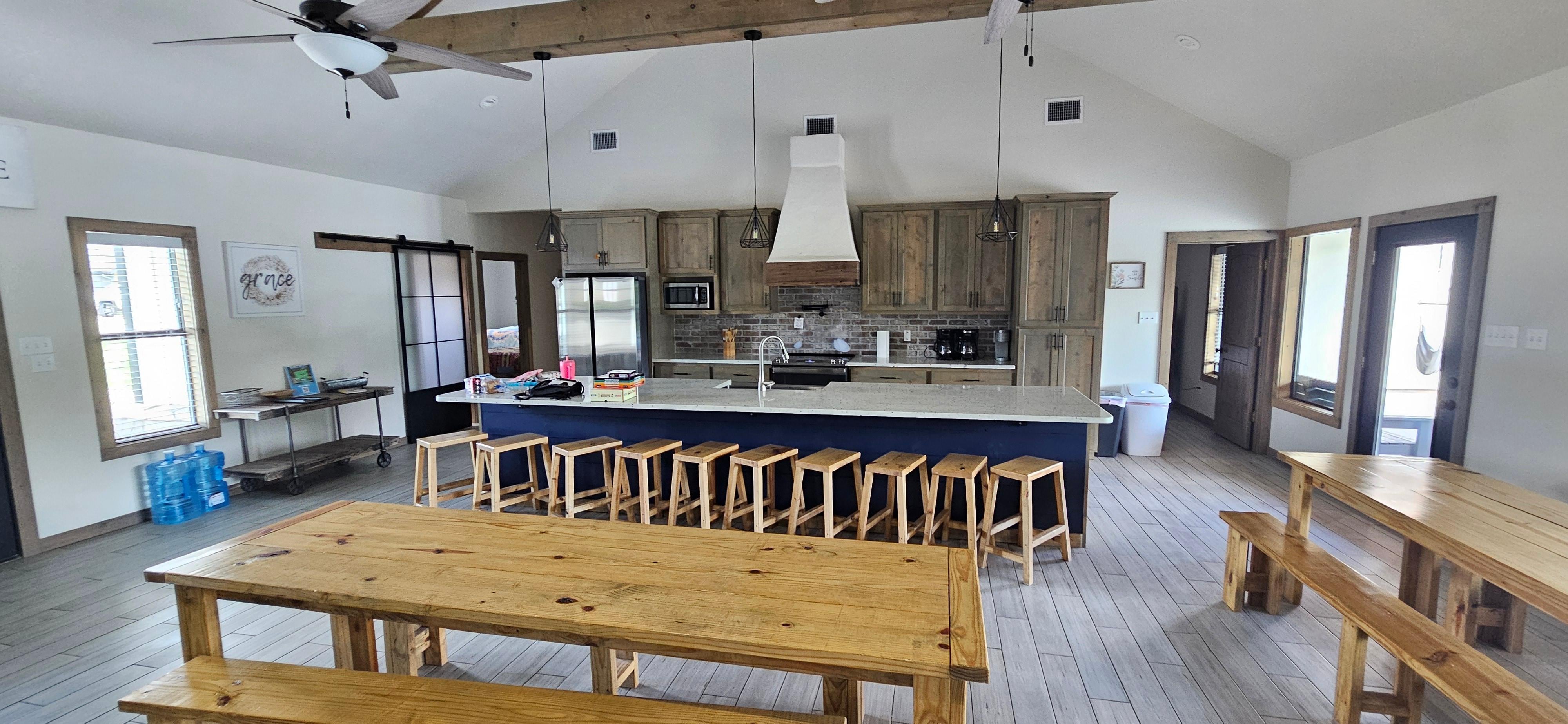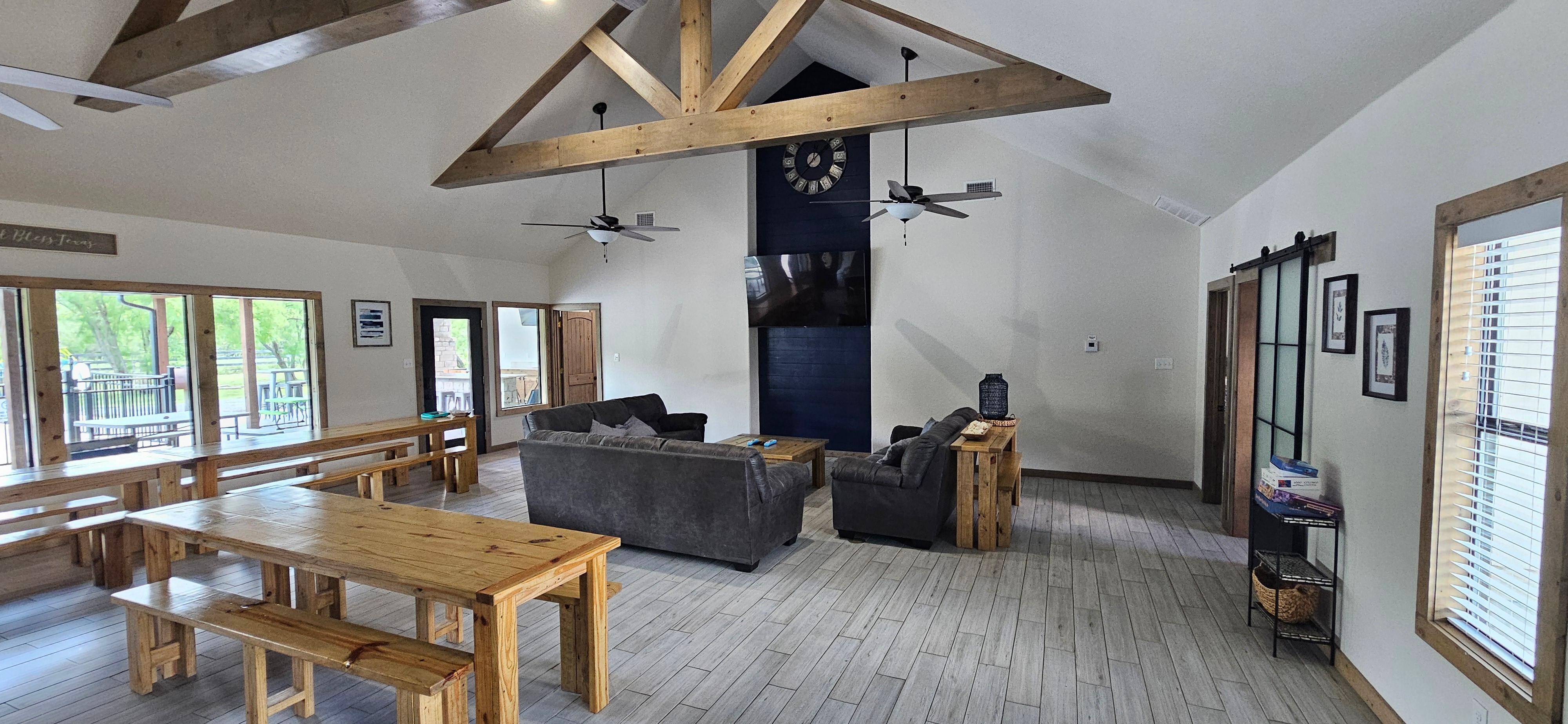 Treat yourself and your loved ones to an unforgettable Frio River vacation at River Ridge, a 6-bedroom, 6-bathroom (with 2 additional half-bathrooms) home sleeping up to 34 people in the coveted Heartstone subdivision. Custom built in 2022, River Ridge boasts an elegant, modern farmhouse style with its exposed beam structure and chic lighting and décor. The spacious floor plan offers more than enough gathering space, including ample seating inside and out. The entertainment area outside features 2 televisions, a fireplace and even an outdoor kitchen with an oven, stove, sink, refrigerator, and bar! Kids and kids at heart can enjoy the private pool and water slide while the designated grill master prepares dinner on the BBQ pit. Book your stay at the ideal venue for making memories to last a lifetime in Concan – River Ridge!