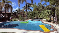 There is a private sitting area just outside your studio door with two chairs, table, patio umbrella, and a tiki torch. A few steps from this sitting area is the large private yard with your own large private heated swimming pool with raised hot tub; enclosed outdoor hot water shower with attached dressing area; fire pit; tiki hut with high back bar seats, TV, stereo, and lighting; covered outdoor kitchen with gas grill, sink with hot and cold water, and mini fridge with freezer. Tiki torches, patio umbrellas, and multiple outdoor sitting areas surrounded by lush tropical landscape are spread out all around the yard.