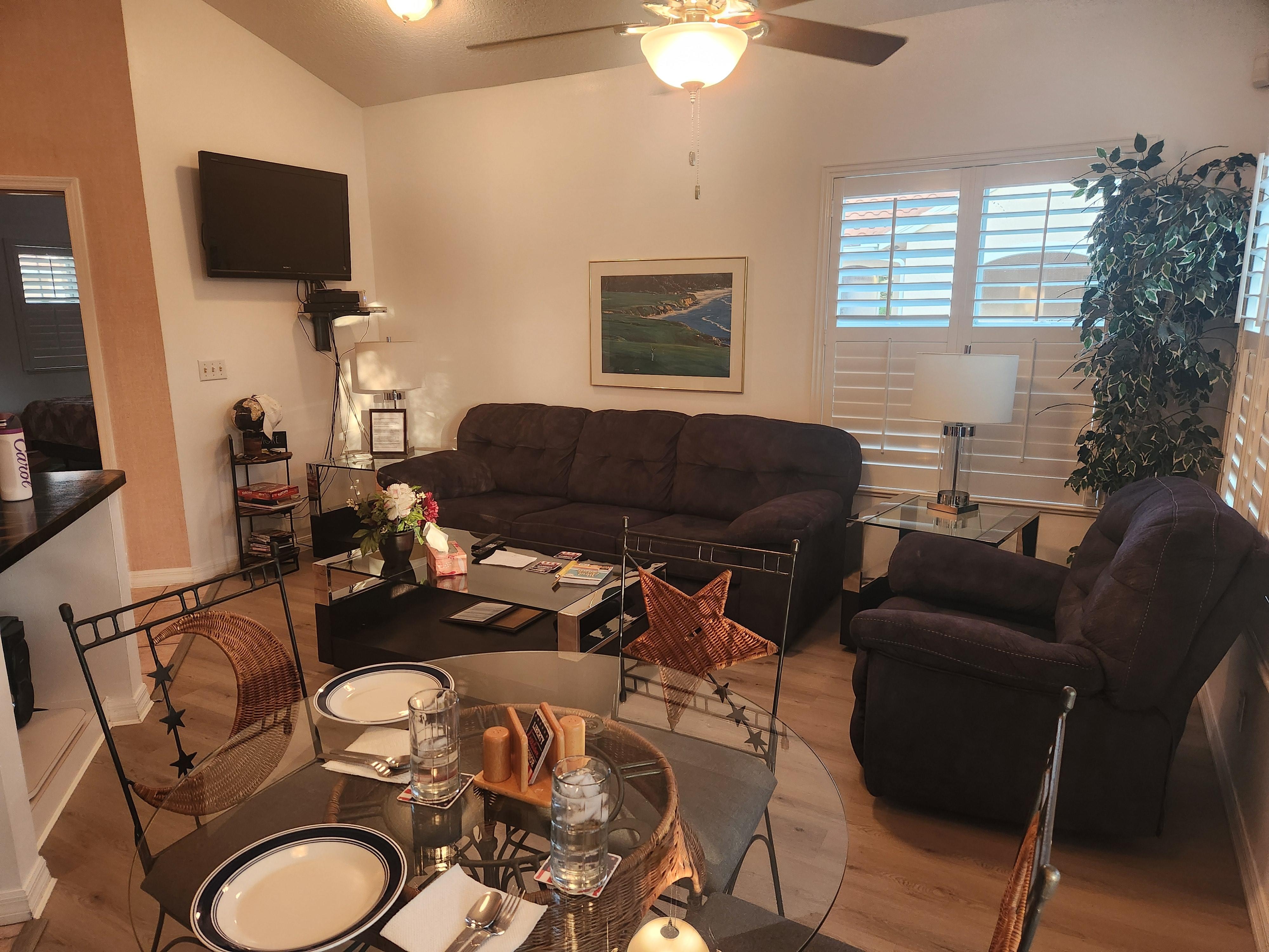Condo was perfect for two people with extra room for short stay guests. Great location and very quiet. Short drive to church (St. Bernadette's), restaurants, stores, shops, golf, etc. Owners were very accommodating. Had a bottle of wine for us on our arrival. The only negative was that we lost the main TV signal the last couple of days. Might have something to do with the remote. Also the cleaning service needs to be instructed to do a more thorough job. Much debris underneath the couch cushions. However, we would certainly be agreeable to returning for a future stay.