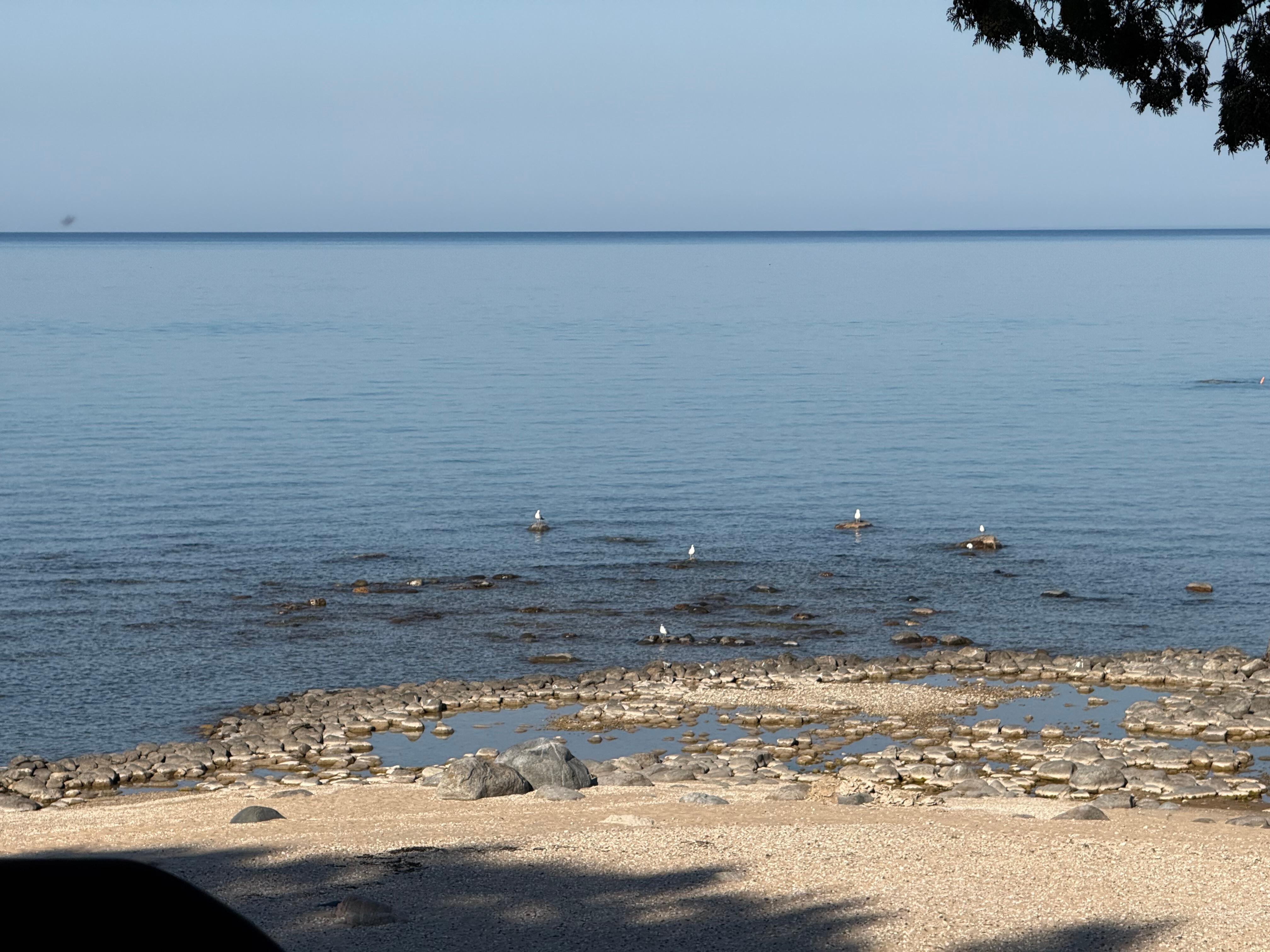 Es ist ein groĂer Stein und Zeder Deck mit Blick auf den Lake Michigan, mit LiegestĂŒhlen und einer aufwendigen Eckbank und Tisch fĂŒr Mahlzeiten im Freien. Die Aussicht von dort ist spektakulĂ€r; und vom Strand nur wenige Schritte entfernt, können Sie Charlevoix, Beaver Island, und den Eingang zu der Meerenge von Mackinaw sehen.
