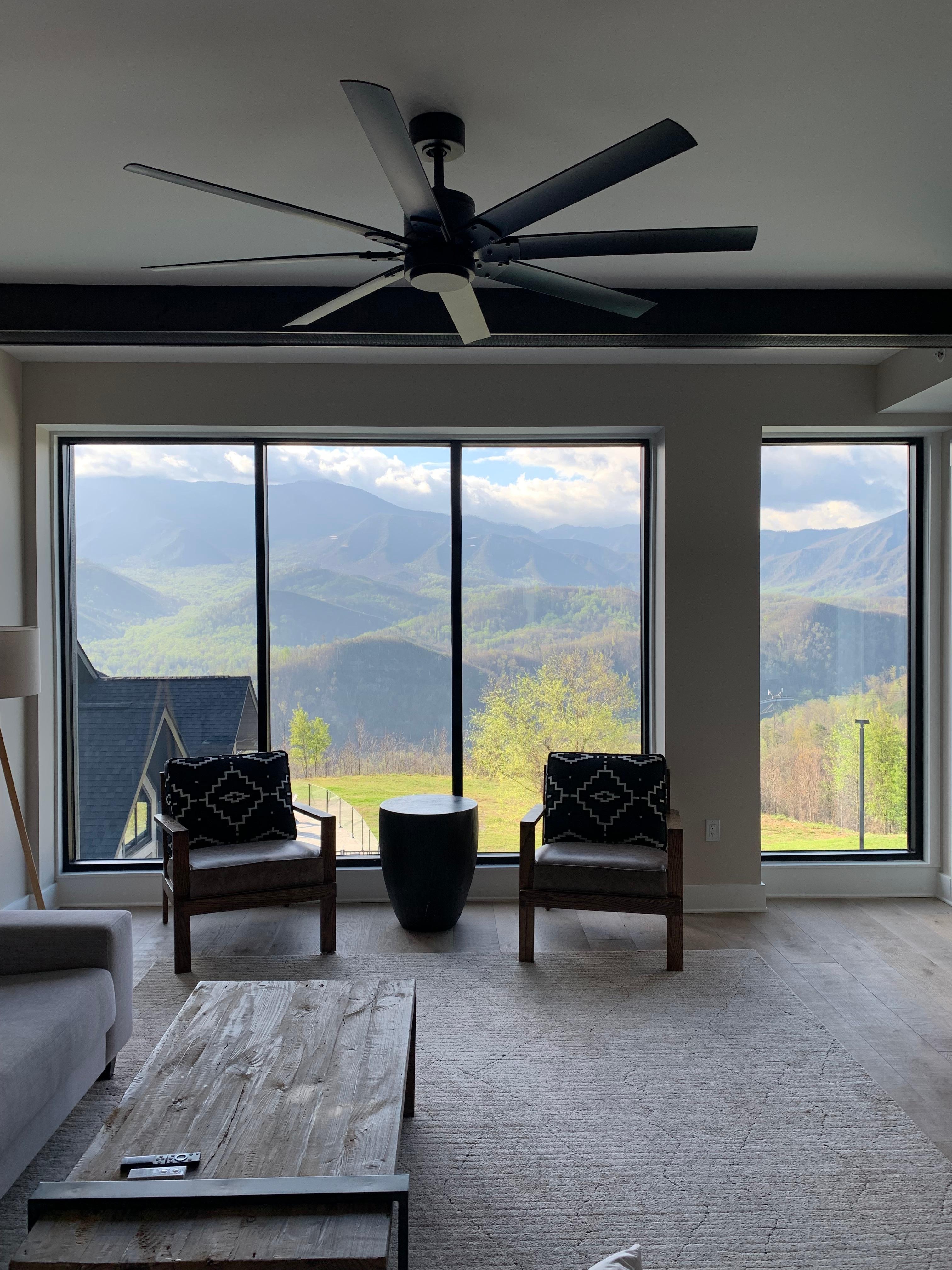 From the moment you enter this two-bedroom, two-bathroom luxury condo, you’ll be awestruck by the spectacular views of the Smokies coming in through the wall of windows. This condo features an open floor plan with comfortable sofas, a gas fireplace, floor-to-ceiling windows, with seating for 6 seats at the bar, a spacious kitchen, a private balcony (perfect for morning coffee or an evening wine down), and 9-10-foot-high ceilings.