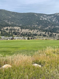 -Incredible view of a small lake, Lone Peak and the second hole on the Big Sky Golf course.