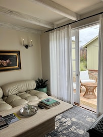 Enter through a cedar dutch door and consider leaving the top open to let in the coastal breeze. Walk into the living room on terra cotta floors- notice the antique ceiling beams, gas fireplace for ambiance & heat, Mario Bellini leather couch, large travertine coffee table, and French doors that lead to the backyard.