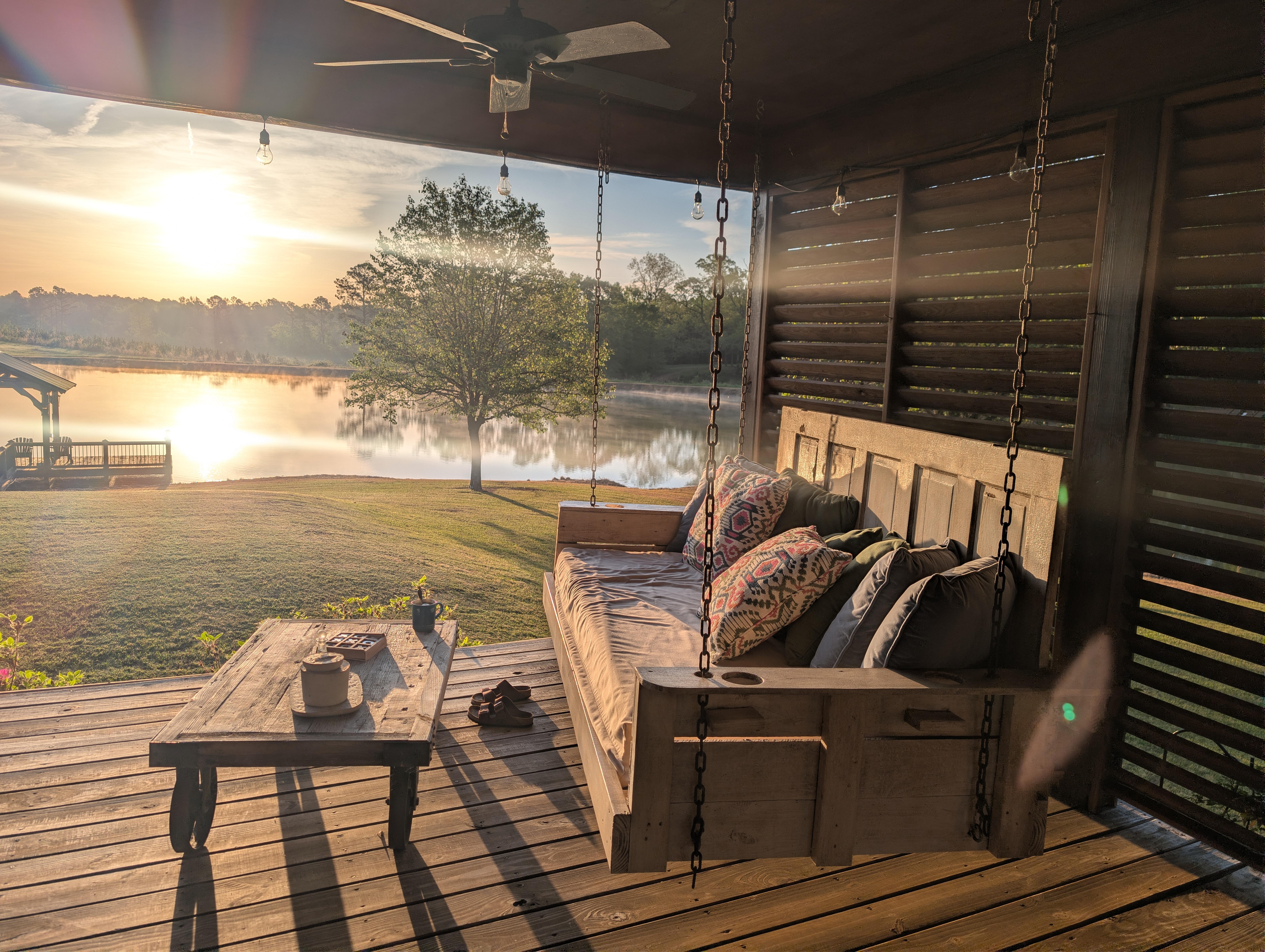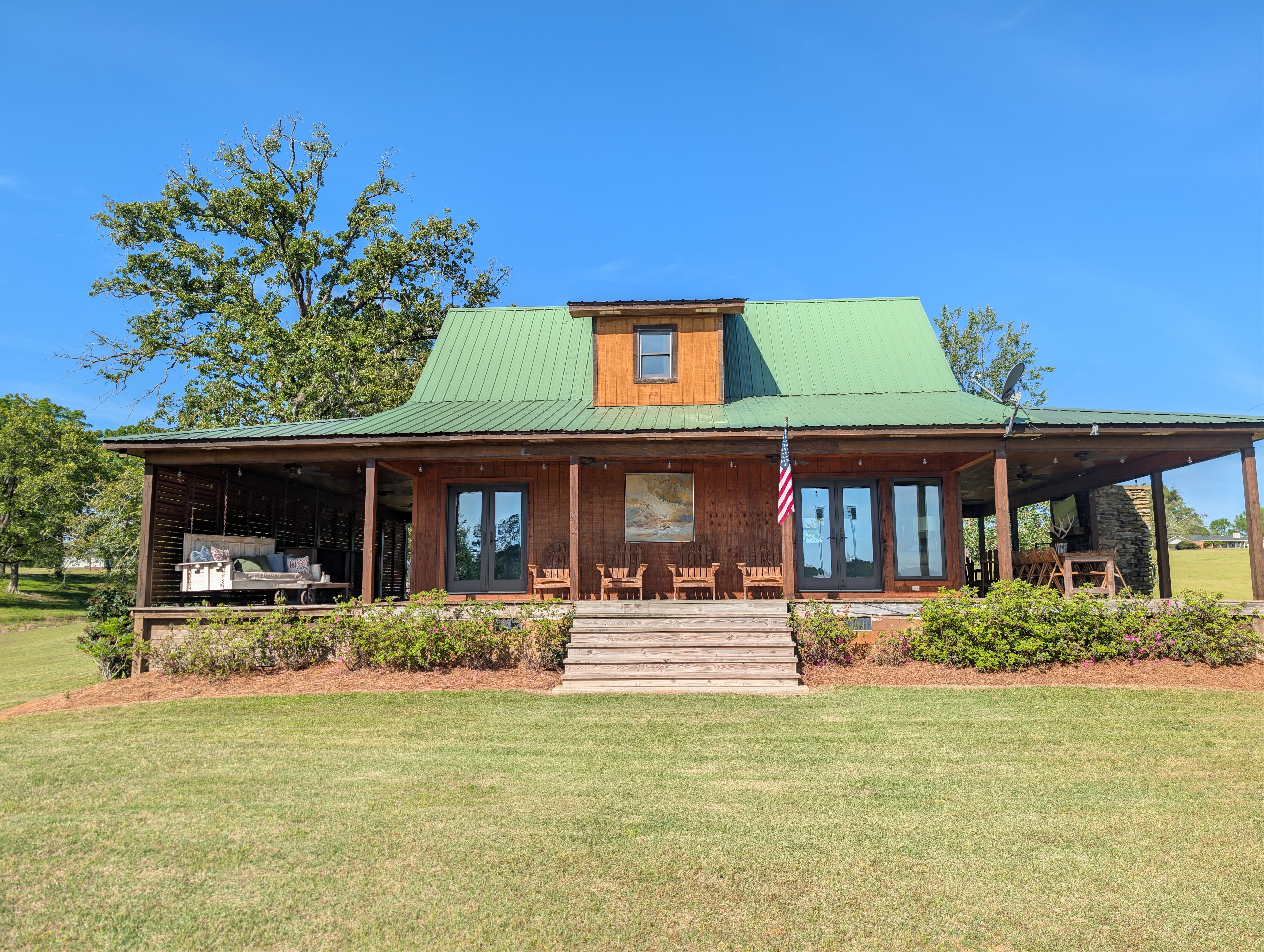 Escape the hustle and bustle of the city and enjoy the tranquility of country living on a generationally owned Mississippi family farm. When you step into Cold Creek Cabin you'll be standing on reclaimed oak flooring over 100 years old. The open kitchen is joined by the living area and contains quartzite leather contertops, stainless steel appliances, double ovens, a side by side refrigerator/freezer, microwave, and all the utensils you'll need to cook until your heart is content. If grilling is your thing you won’t find a better setup than our Weber propane gas grill with every imaginable utensil. While you’re grilling you can build a fire in the outdoor fireplace and/or catch a game on the big screen LGTV. As you peek beyond the living area through the large wall to wall casement windows and french doors your eyes will immediately be drawn to the the 50-plus year old pond stocked with bream, crappie, and bass and the covered pavilion that sits out over the water. Just off of the living area you'll find a short hallway that leads to both the master bedroom and a bathroom that can either be shared with downstairs guests or kept privately for occupants of the master bedroom. You'll also find a combination washer/dryer closet in that hallway. The master bedroom has full length windows that can let in as much natural light as you'd like or you can close the drapes and go into total seclusion. Upstairs you'll find two bedrooms and a shared bath. One bedroom has a queen size bed that has a pond view, Boll and Branch sheets, and a 43” smart TV. The other bedroom has two twin bunk beds with high thread count sheets that also overlook the pond. The full bathroom is in the hallway between the two bedrooms and includes high quality H2O soaps, shampoos, conditioners, and lotions.