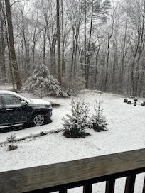 The first floor of the cabin is an open floor plan with living room, dining room, fully furnished kitchen, desk and entrance to the front and back deck. The back deck has a gas grill(with utensils) and sitting area. The covered front porch is a great spot to sit and listen to the rain or watch wildlife.