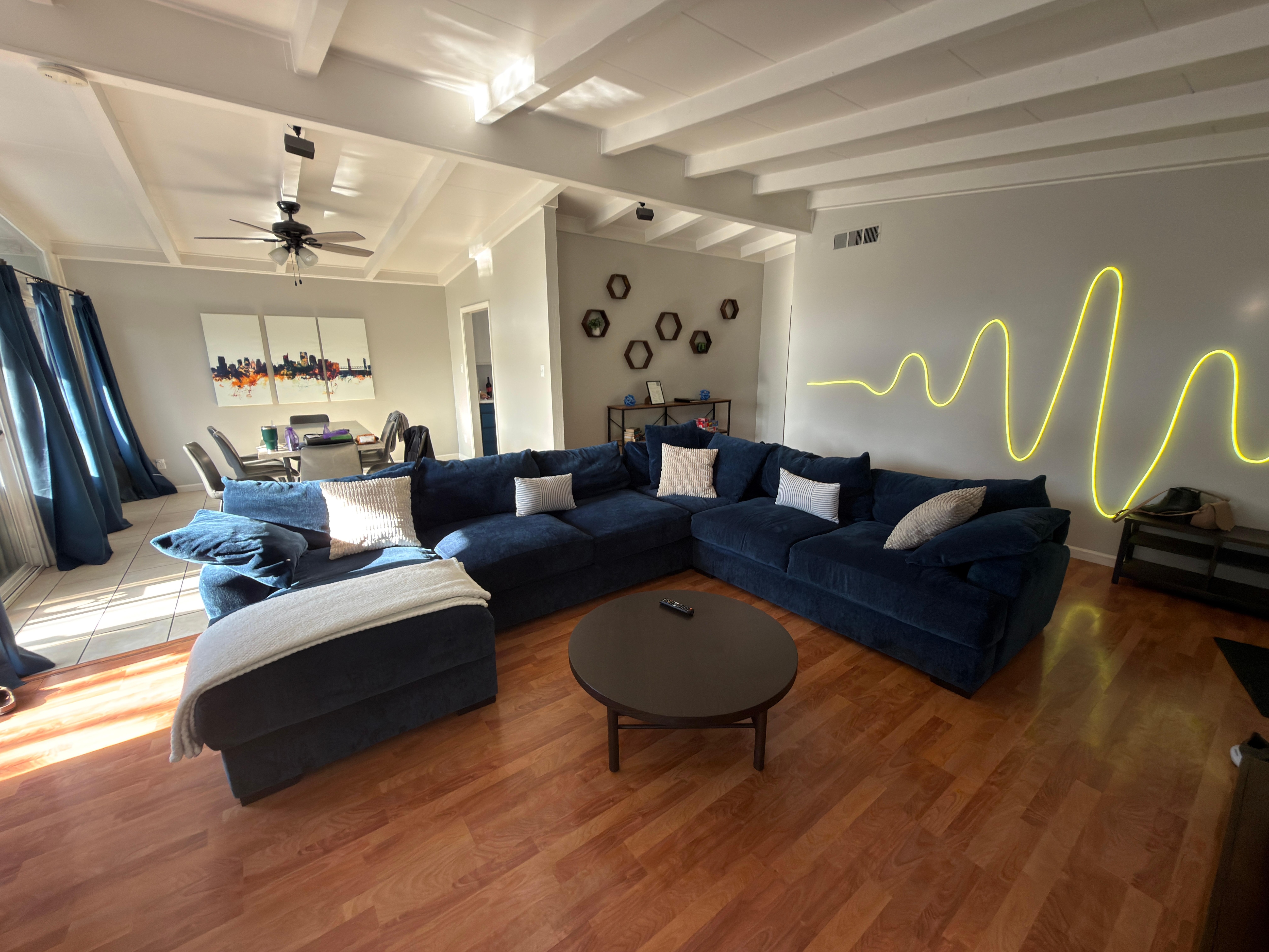 Sink into the luxuriously comfortable couch in the living room and enjoy streaming your favorite shows on the large 75” smart TV.