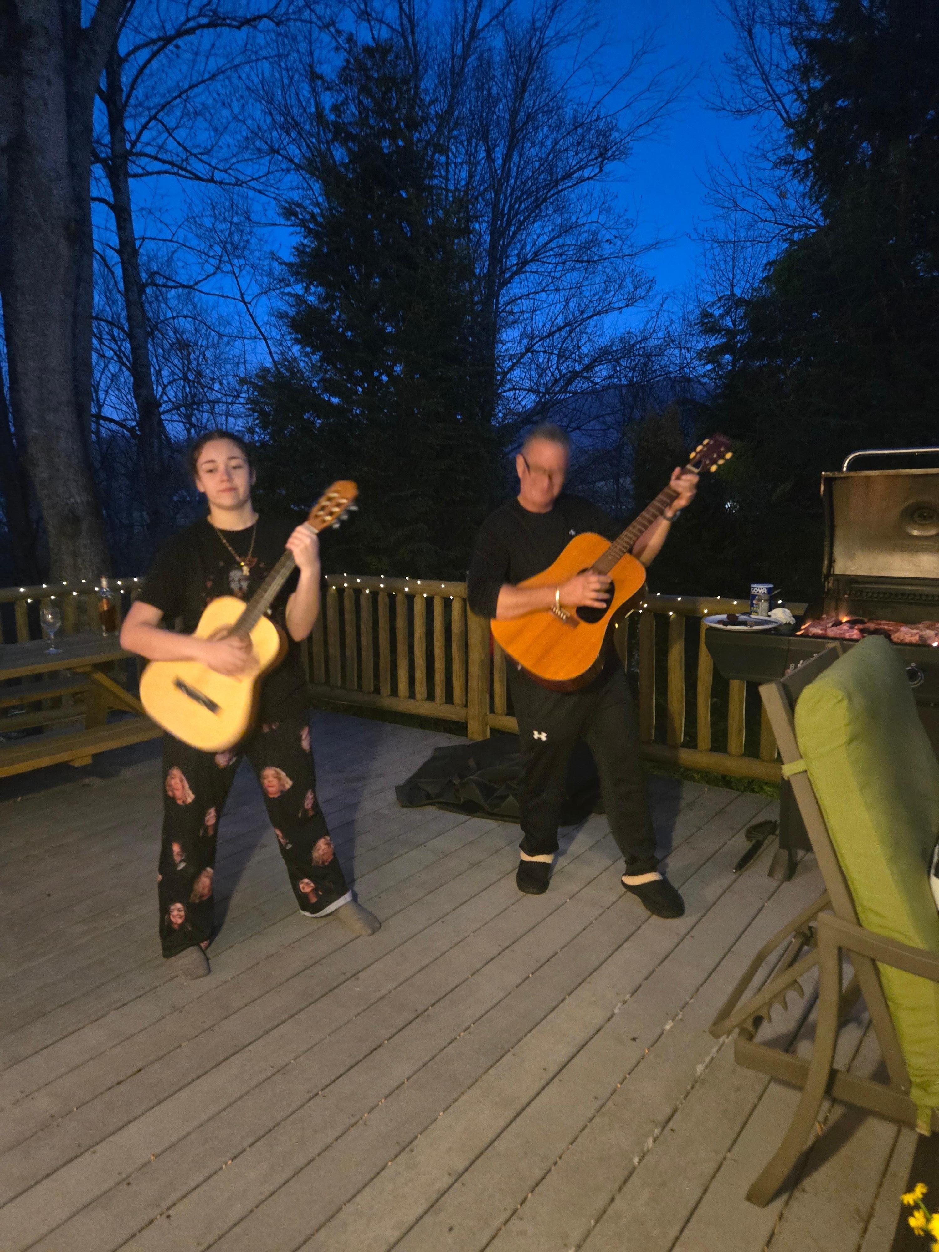 The home features an open-concept layout with a dining table comfortably seating 8, ideal for enjoying a meal or playing board games. The living room includes a 65" curved flat-screen smart TV, perfect for streaming your favorite services. The room boasts expansive east-facing windows and French doors, leading out to the deck with a full-size gas grill, a picnic table, and casual seating. At night, the deck railing is illuminated with fairy lights, creating a magical ambiance as you gaze out at the expansive, star-filled sky.