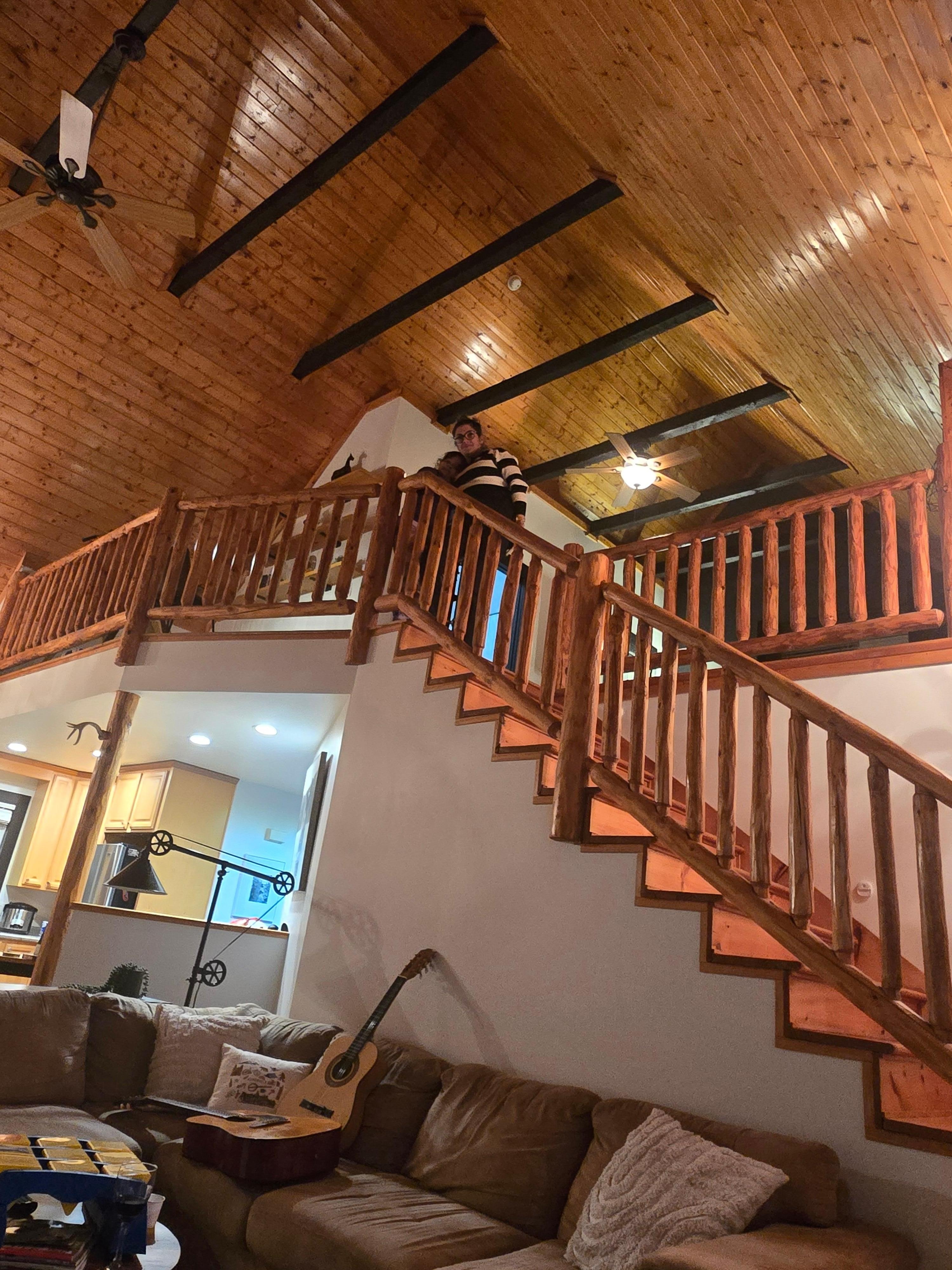 The primary bedroom with a comfy king bed is upstairs in an open loft, offering stunning views of the mountains and majestic tree line. Nearby, a dedicated workspace with a desk, lamp w/ USB charger, and wireless speaker allows you to enjoy the same mountain views. High-speed internet makes this spot perfect for remote workers.