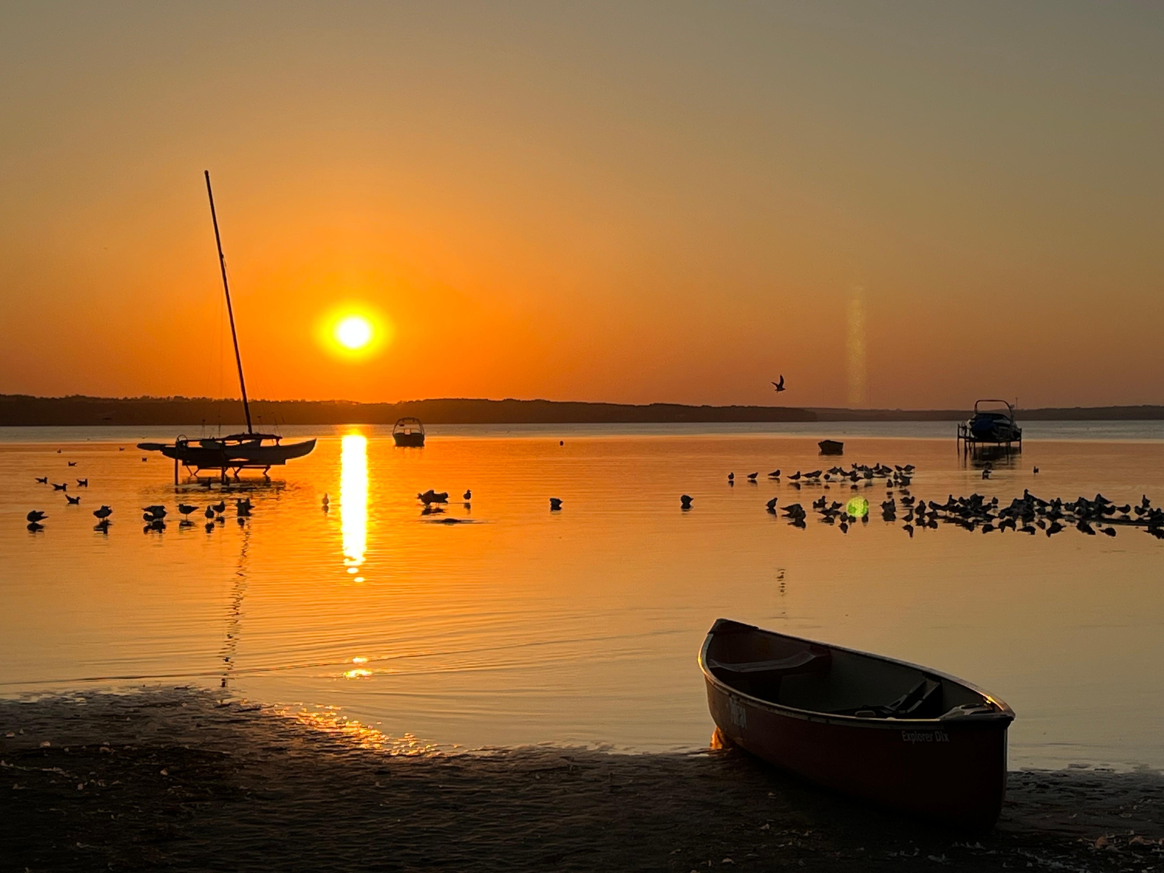 Vordere und hintere Decks mit großartiger Sonneneinstrahlung zum Bräunen während des Tages und schönen Schattenoptionen. Auch schöne, private Hinterhof mit einer Feuerstelle für Hot Dog Braten, einem Deck mit Tisch, Sonnenschirm und 4 Stühlen. Gasgrill- und Terrassenmöbel-Set mit einer Couch, 4 Clubsesseln, 2 Hockern, 2 Felsstühlen, Kaffee- und Beistelltischen sowie einer Bank auf dem oberen Vorderdeck mit Blick auf den See. Das hintere Deck verfügt über Mahlzeiten im Freien mit Sonnenschirm. SEEBLICK VON INNEN UND VORDERSEITE und Sie können GENIESSEN - ERSTAUNLICHE SONNENUNTERGÄNGE Bitte bringen Sie Ihr eigenes Brennholz mit.(Brennholz kann in der Stadt gekauft werden). Viele Stühle um die Feuerstelle zu sitzen und einige Liegestühle zum Strand zu übernehmen.