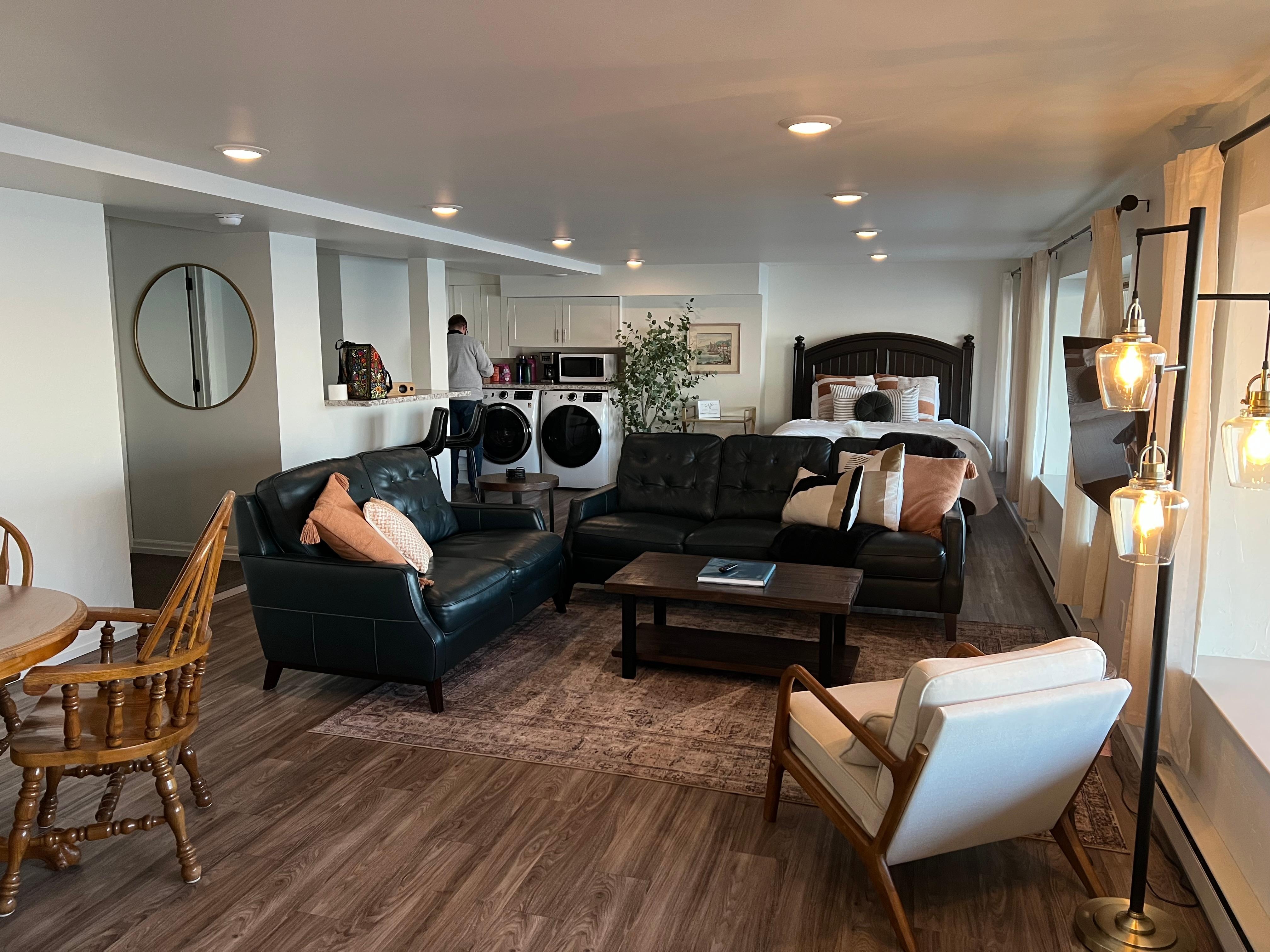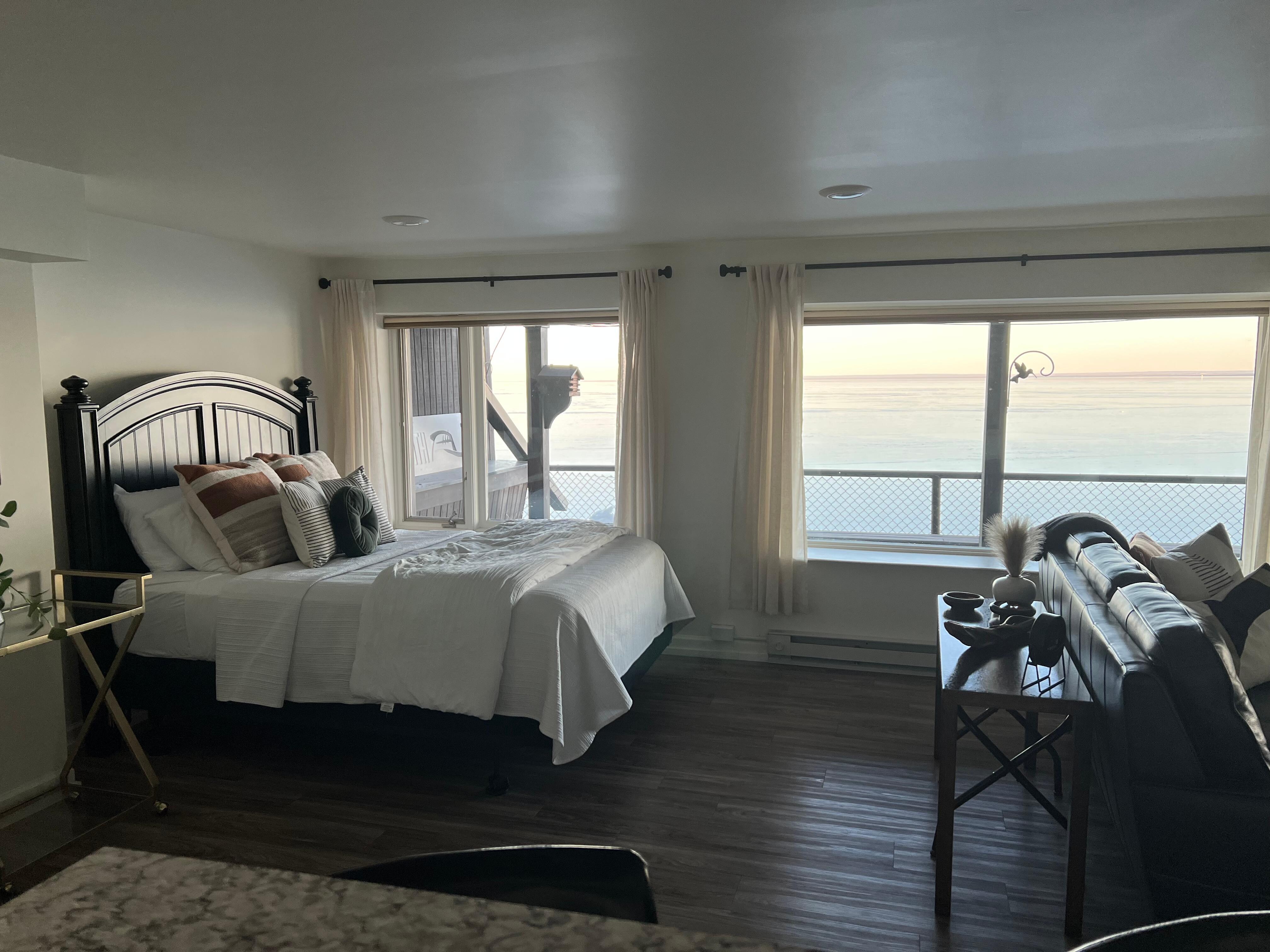 As you enter this studio style apartment, guests will descend a flight of stairs which will lead to the lower level of the building overlooking Lake Superior. This space includes the living room, dining area, kitchen, bathroom and sleeping quarters all on one level.