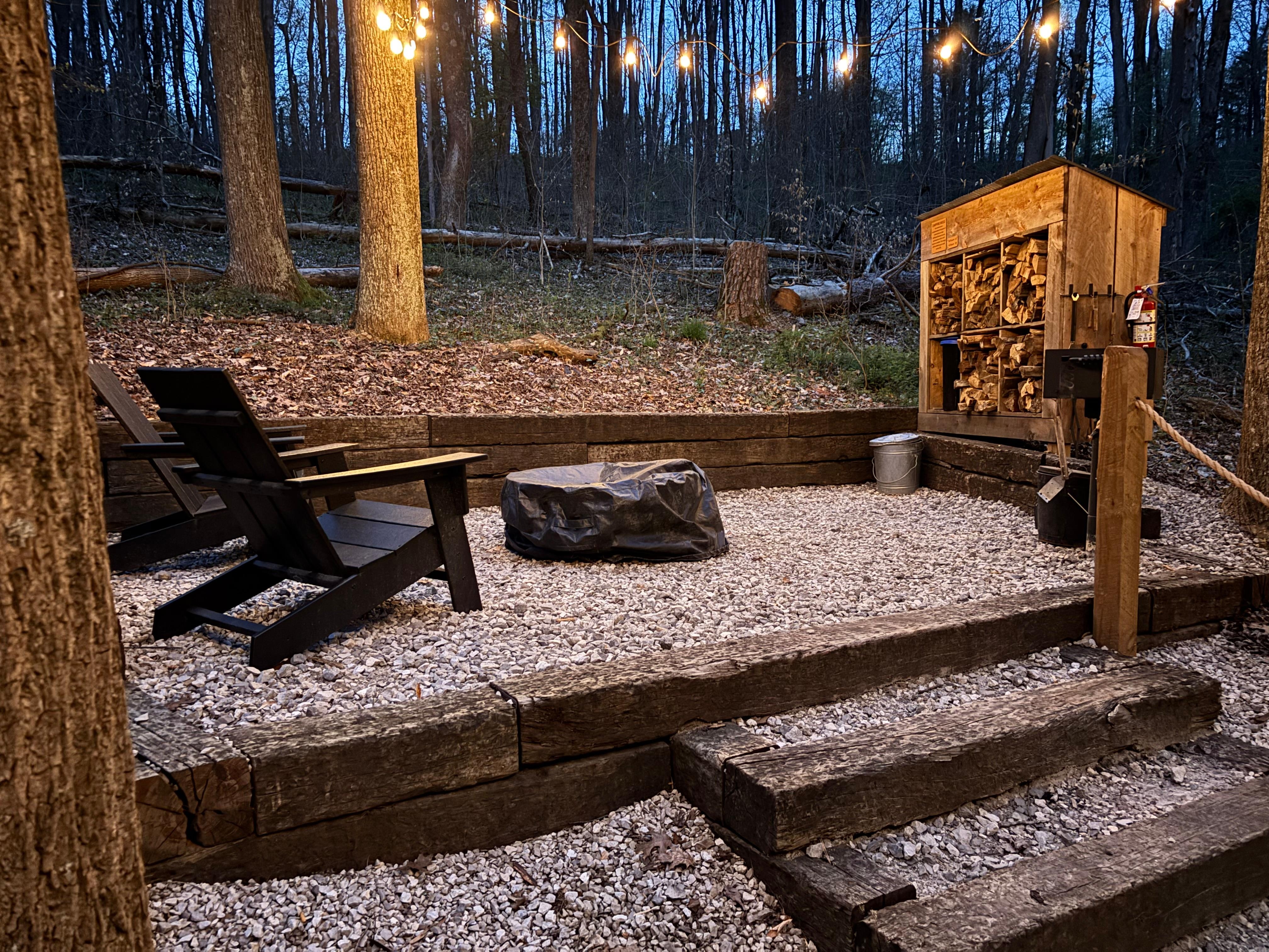 Outside: charcoal grill, grill tools, charcoal, lighter fluid, lighter, fire pit set with extra wood, outdoor seating areas, hot tub, additional firewood available onsite for purchase