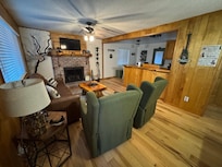 Inside, you'll find two comfortable bedrooms—one with a king bed and the other with a queen—providing a restful retreat for up to four guests. Each bedroom is equipped with a smart TV, as is the living room, so you can unwind with your favorite shows or movies after a day of exploring. The cabin also features a full bathroom, a cozy fireplace, and central heating and air conditioning, ensuring comfort in every season. Additionally, a propane wall heater in the bathroom adds an extra touch of warmth.