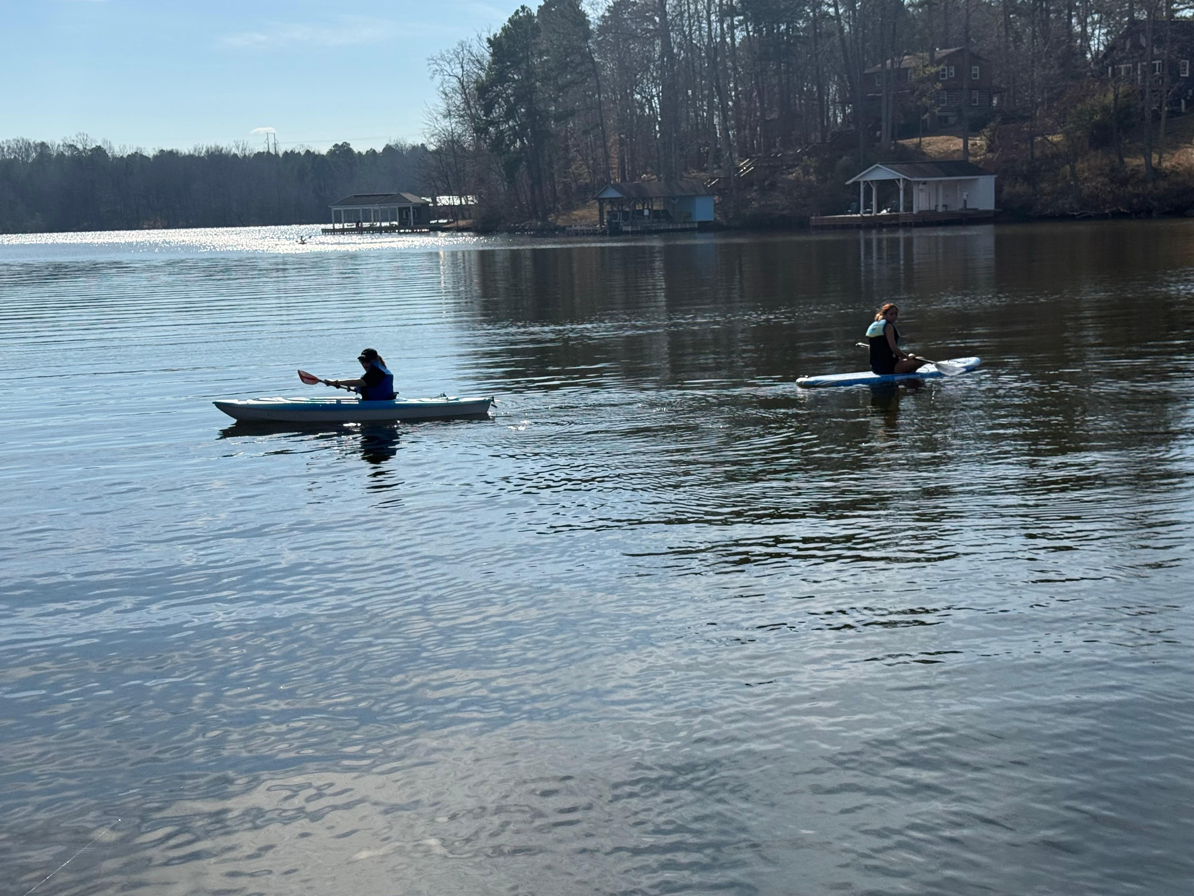 The private dock is also stocked with an assortment of life jackets. water toys, fishing poles, kayaks and paddle boards.