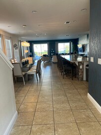 The gourmet kitchen is fully equipped with modern appliances, including two refrigerators, two dishwashers, and all essential cookware. The breakfast nook seats eight guests, while the formal dining room accommodates up to twelve. The living room offers ample seating and a 65-inch smart TV.