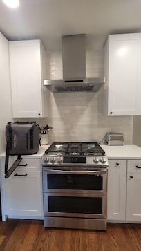 Fully Renovated Kitchen – 5-burner gas stove, stainless steel appliances, and well stocked dining and cookware