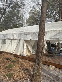 Experience the perfect blend of camping and comfort at the Rocky Top Retreat Glamping Tent. Relax on the deck with cozy seating and wooded views. The 14'x16' canvas tent is equipped with electricity, air conditioning, and a queen bed for a restful night. Two cots are available if needed (bring your own linens). Outside, enjoy a fire ring, rocking chairs, and a picnic table. Bathhouse, playground, and laundry are nearby. Pets are welcome for $25/night. Unplug and embrace nature!