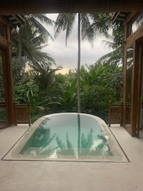 This treehouse is elevated. It includes a rope bridge to the entrance door, steep steep rail-less stairs to the second storey, open pool and a high drop from the pool’s edge. Due to the quirky characteristics of this home, we recommend that this villa is not suitable for children or persons not able-bodied.