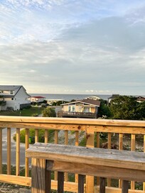 Directly across the hall, the second upstairs queen suite leads to the crow's nest! This light and airy room features spectacular views, a queen bed, a large dresser for storage, and a luggage rack for your convenience. While the large TV in the room can be nice, the outside deck and crow's nest make this room stand out. Take in the stunning ocean views and cool breeze, and let your worries disappear!
