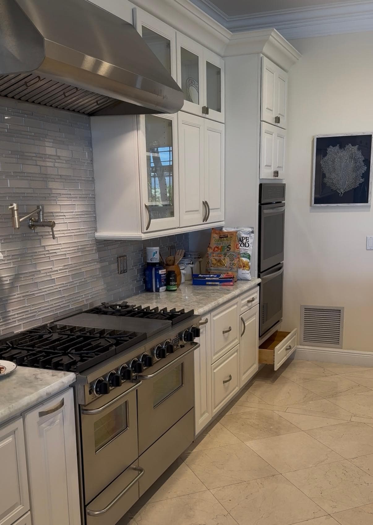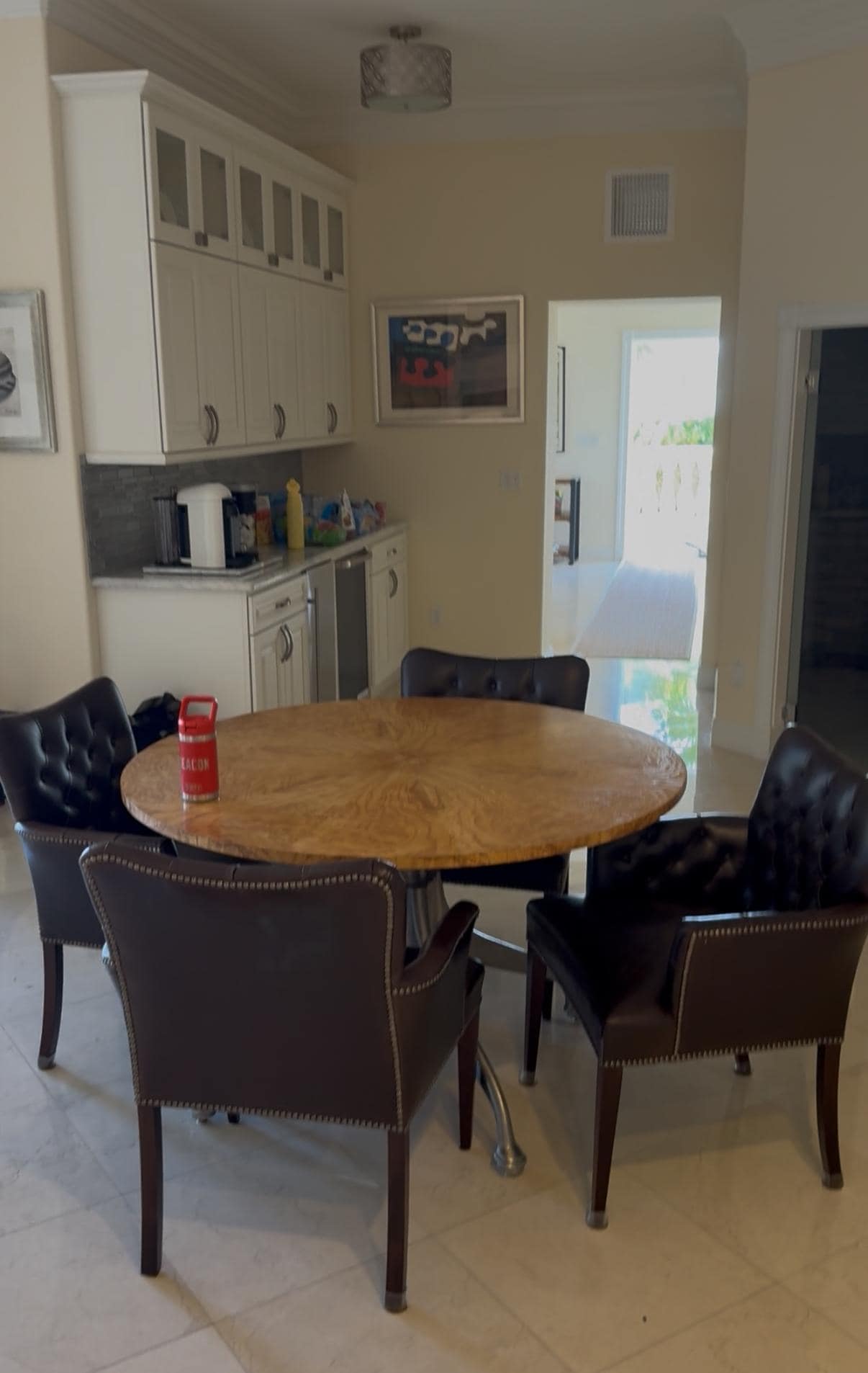 INTERIOR LUXURY: Inside, the open-concept living area is designed for connection and comfort, with multiple seating zones perfect for entertaining large groups. The chef’s kitchen is a culinary dream—equipped with dual refrigerators, a wine fridge, two dishwashers, a 6-burner cooktop, an ice maker, and a dedicated coffee/cocktail bar. Gather around the oversized island or one of the two dining tables, and let the natural light pour in through elegant glass French doors leading out to the serene outdoor space.