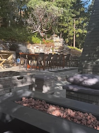 ○ Backyard: Stunning backyard surrounded by trees and plants. Includes a large 10-person dining table to enjoy meals in nature, a firepit with patio furniture, 6 person jacuzzi, built-in BBQ, additional seating locations, and a hammock for relaxing.