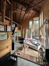 Beginnen Sie Ihren Urlaub in den Rocky Mountains mit einer heißen Tasse Kaffee, während Sie sich zurücklehnen und auf dem geräumigen Deck dieser einzigartigen Berghütte entspannen. Ein bequemes Schnittsofa und ein Tisch sowie ein Gas- und Holzkohlegrill machen das Deck zu einem großartigen Ort, um die Aussicht zu genießen, während Sie mit der Gruppe kochen.