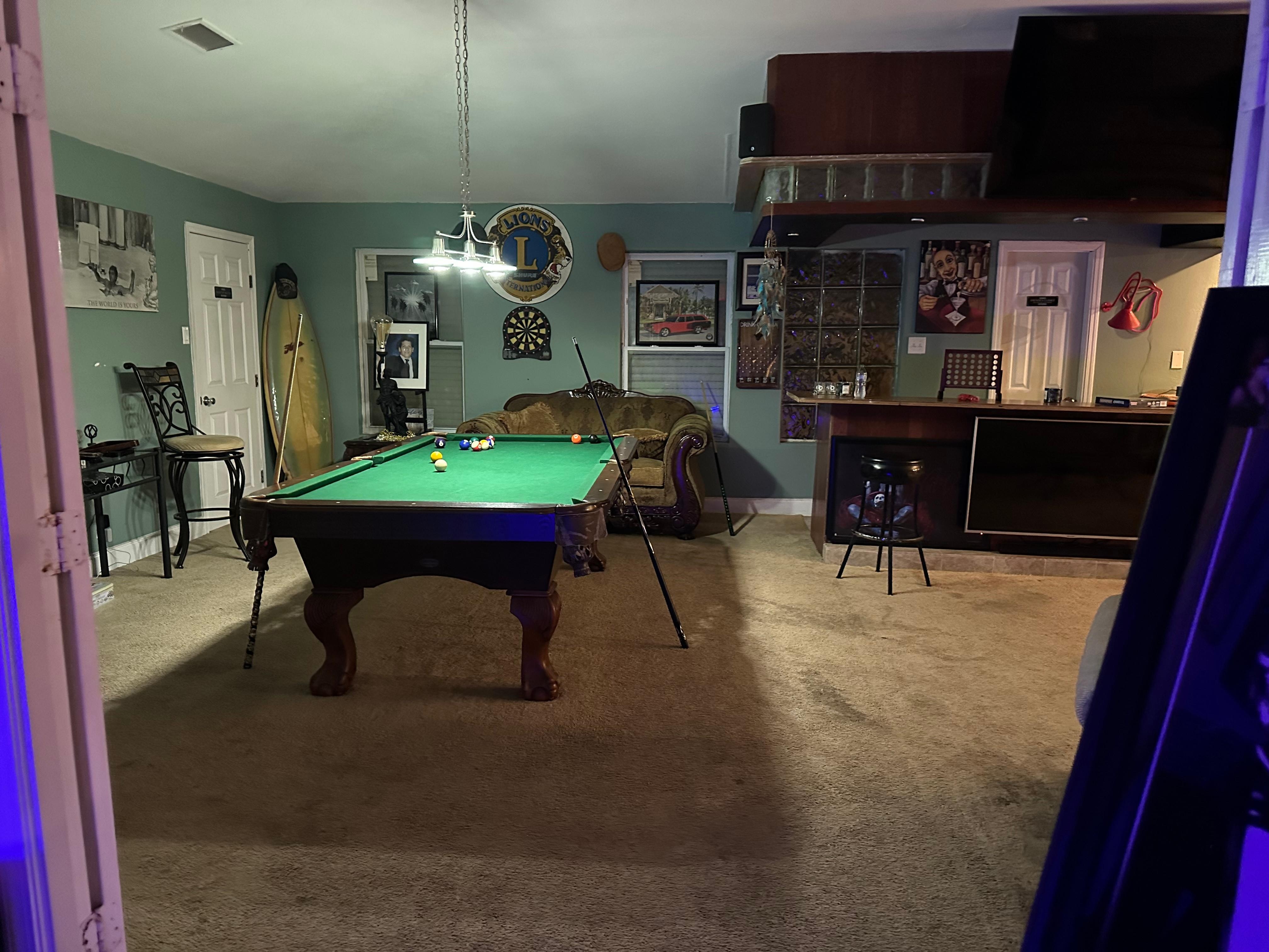 Property has an interesting eclectic decor, something different around every corner. Some of the pictures didn't pass our PG rating, for the kids with us and parents made adjustments. We were met with skeletons on the front porch since halloween had just passed. Easy entry instructions were provided with no issues. Our family enjoyed the game room and weather let enjoy games and visiting on the patio area. The fishing was a fun plus and caught and released several. Definitely a party house vibe in a nice area. Needs some work during the off season, mostly carpeting. Nice convenient pre cruise stay.