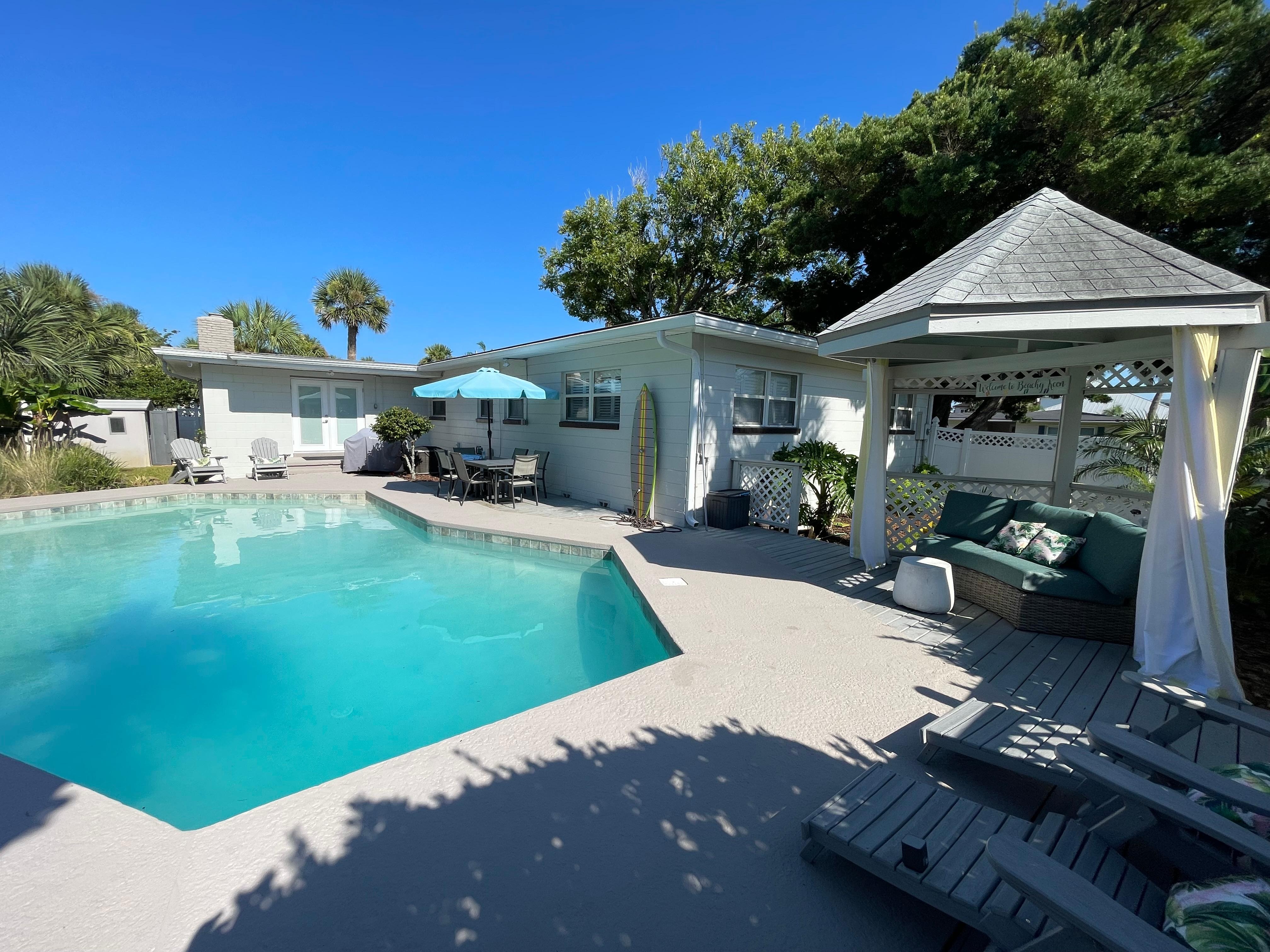 The highlight of the home is your resort-style outdoor oasis. Lounge poolside with your favorite drink, cool off with a swim, or enjoy meals al fresco under the shaded cabana. The outdoor dining table provides additional space for snacks or evening gatherings under the stars.