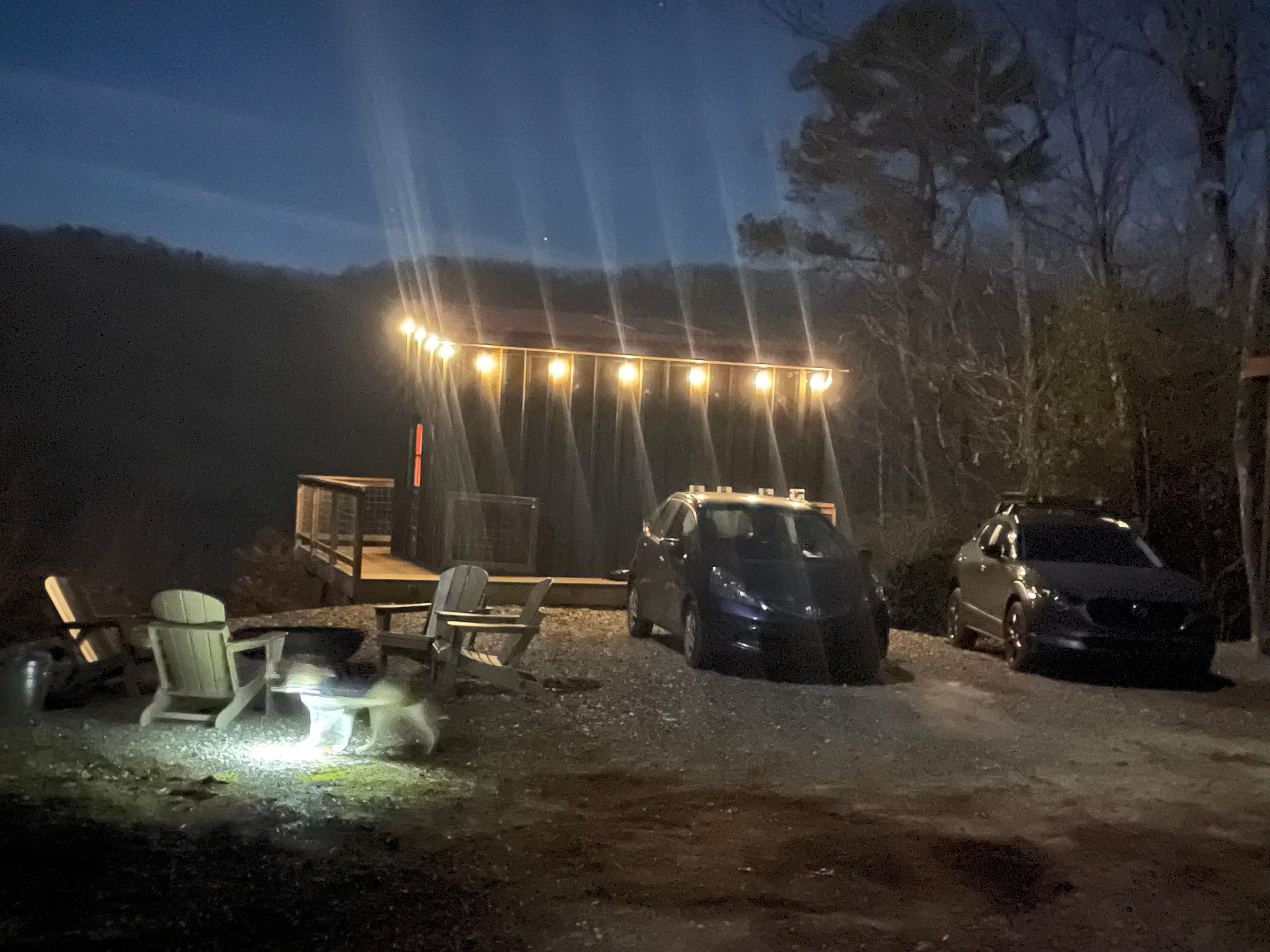 The cabin is situated on 2.5 acres of land. There is a large section cleared off where the cabin is located. There is plenty of room for the fire pit, vehicles, animals, and any outdoor games you might want to bring (cornhole).