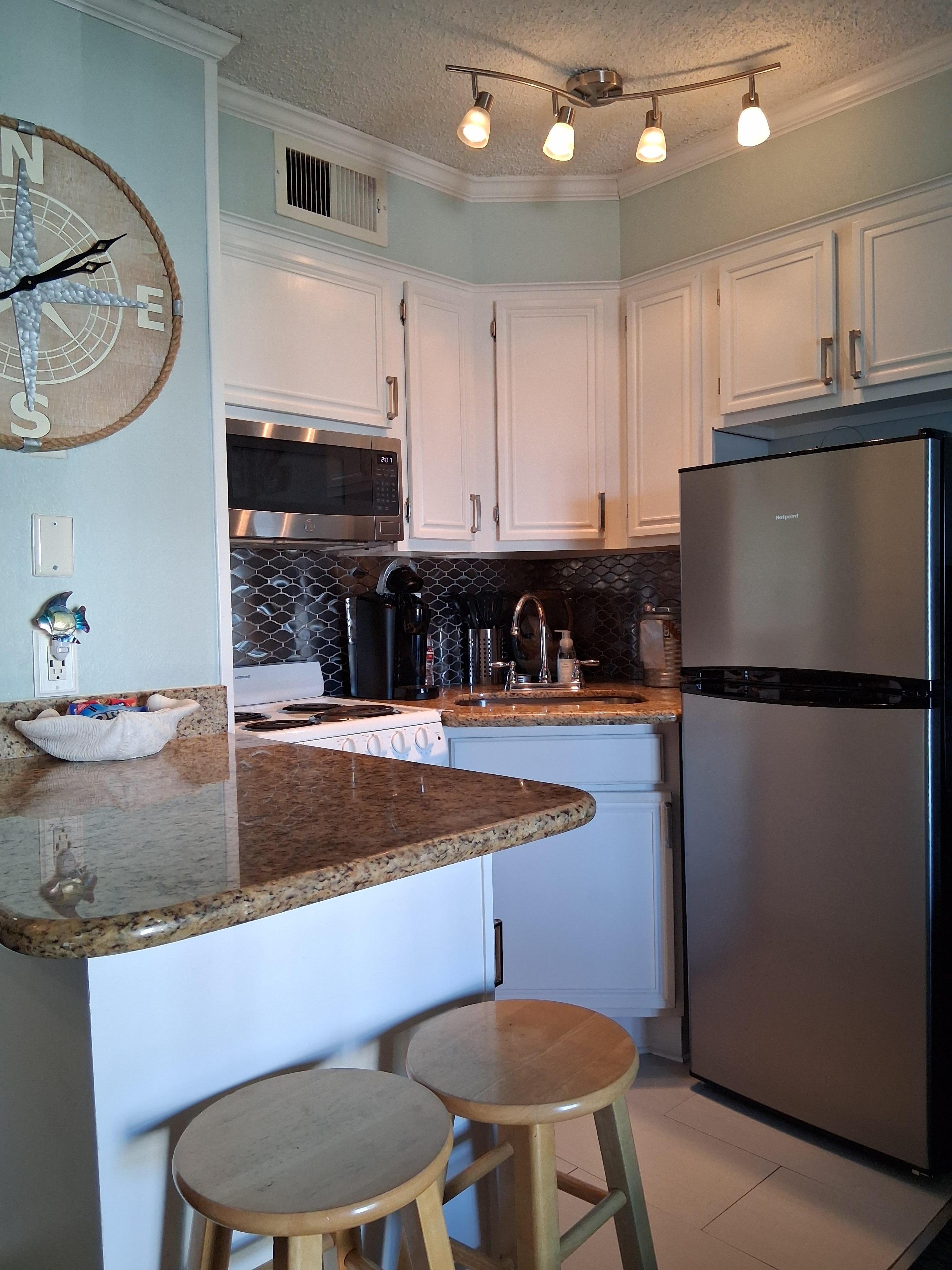 Die Wohnung verfügt über alles, was man für einen angenehmen Wochenende benötigen, einschließlich einer Küche mit Granit-Arbeitsplatten, Kühlschrank, Herd, Kochutensilien, Geschirr, Kaffeemaschine und Mikrowelle. BBQ Grills und 2 Pools (einer davon beheizt) auf dem Gelände. Es gibt Aufzüge und Gepäckwagen für Ihre Bequemlichkeit.