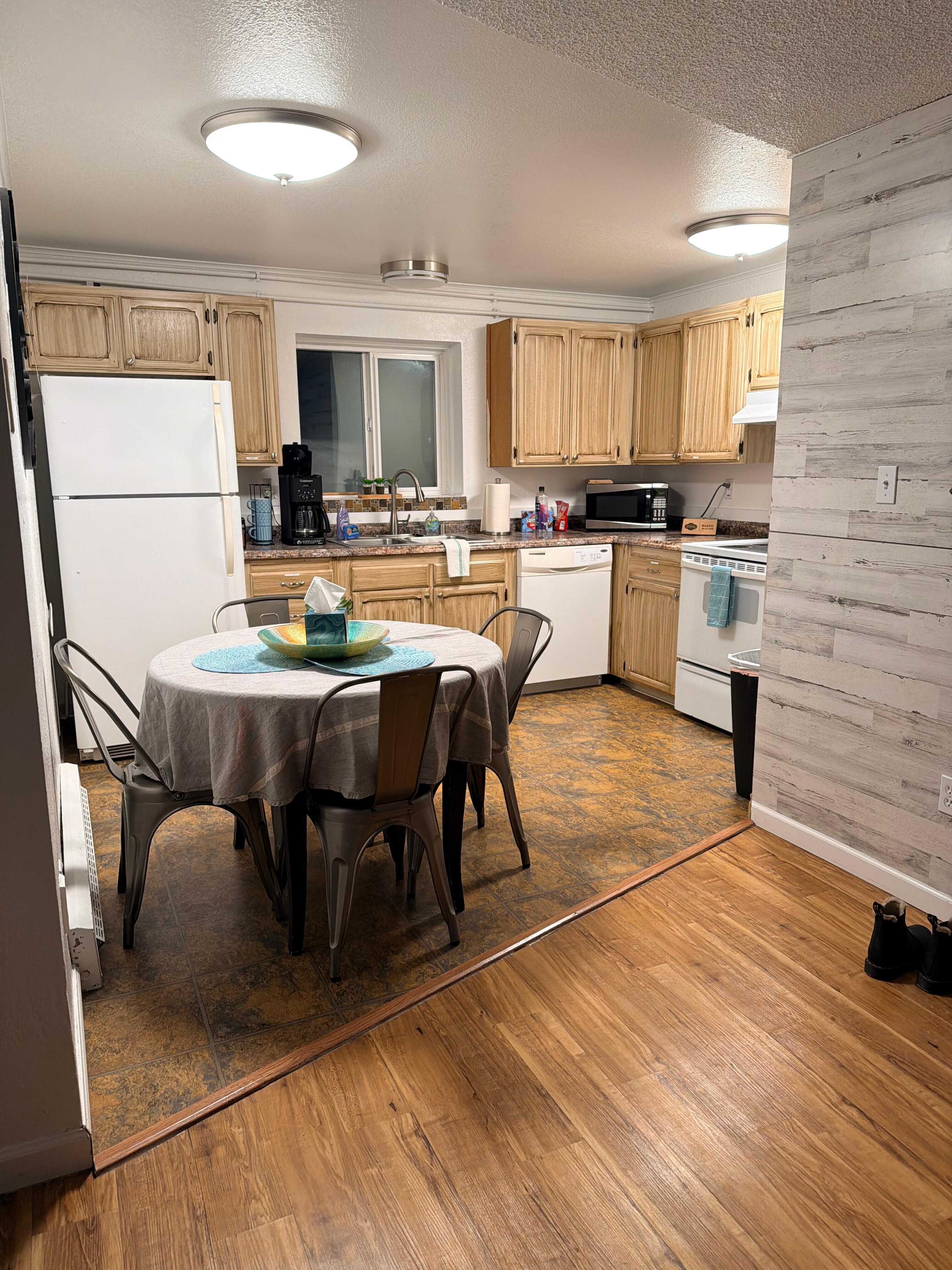 Enjoy this comfortable two-bedroom apartment located near Campbell Creek and the airport. This lower-level unit features a bright living area, Smart TV, and fully equipped kitchen with dining space. Both bedrooms offer cozy queen beds with quality linens. Guests have access to shared laundry, free on-site parking, and a peaceful yard that opens to Campbell Creek Trail for walking or biking.