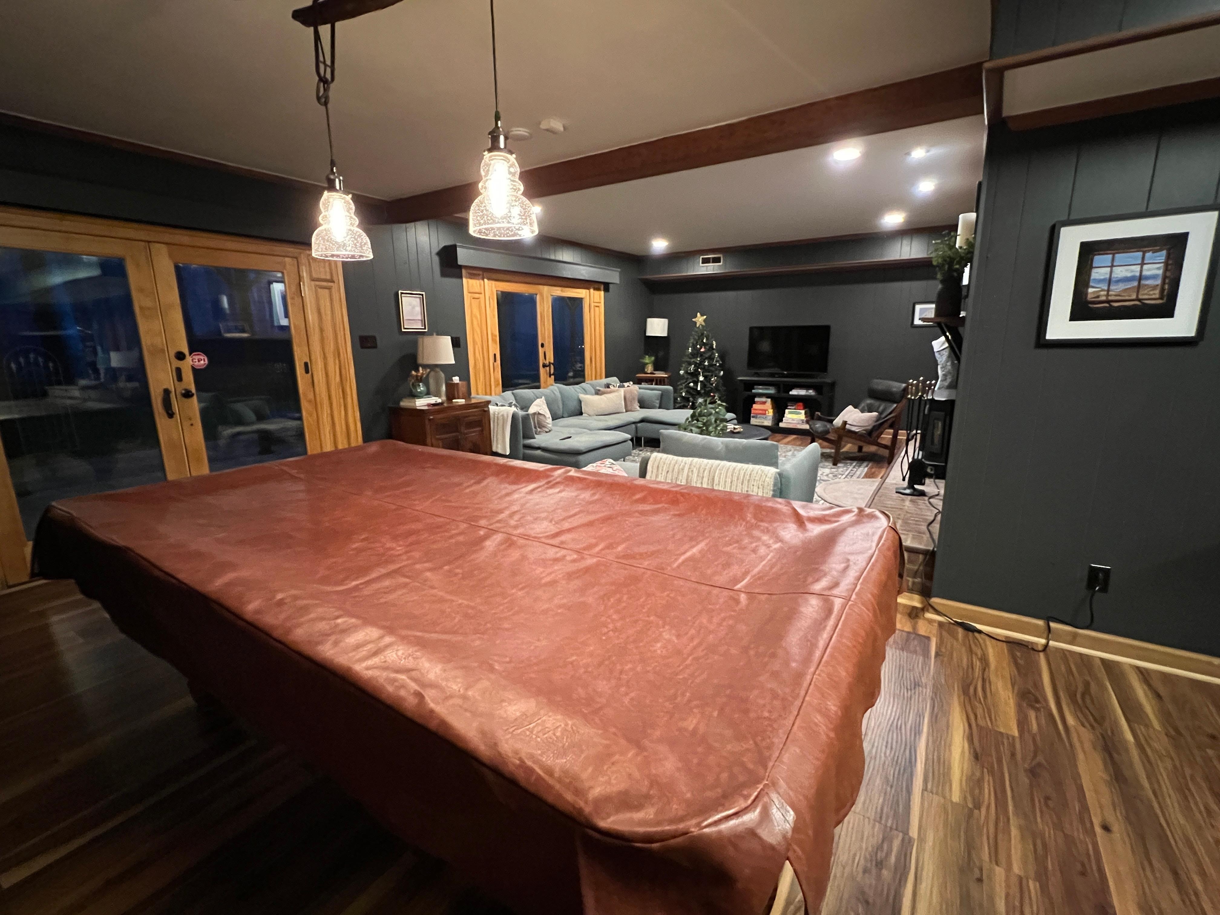 - Downstairs: Walk-out family room with bar, pool table, and wood stove
