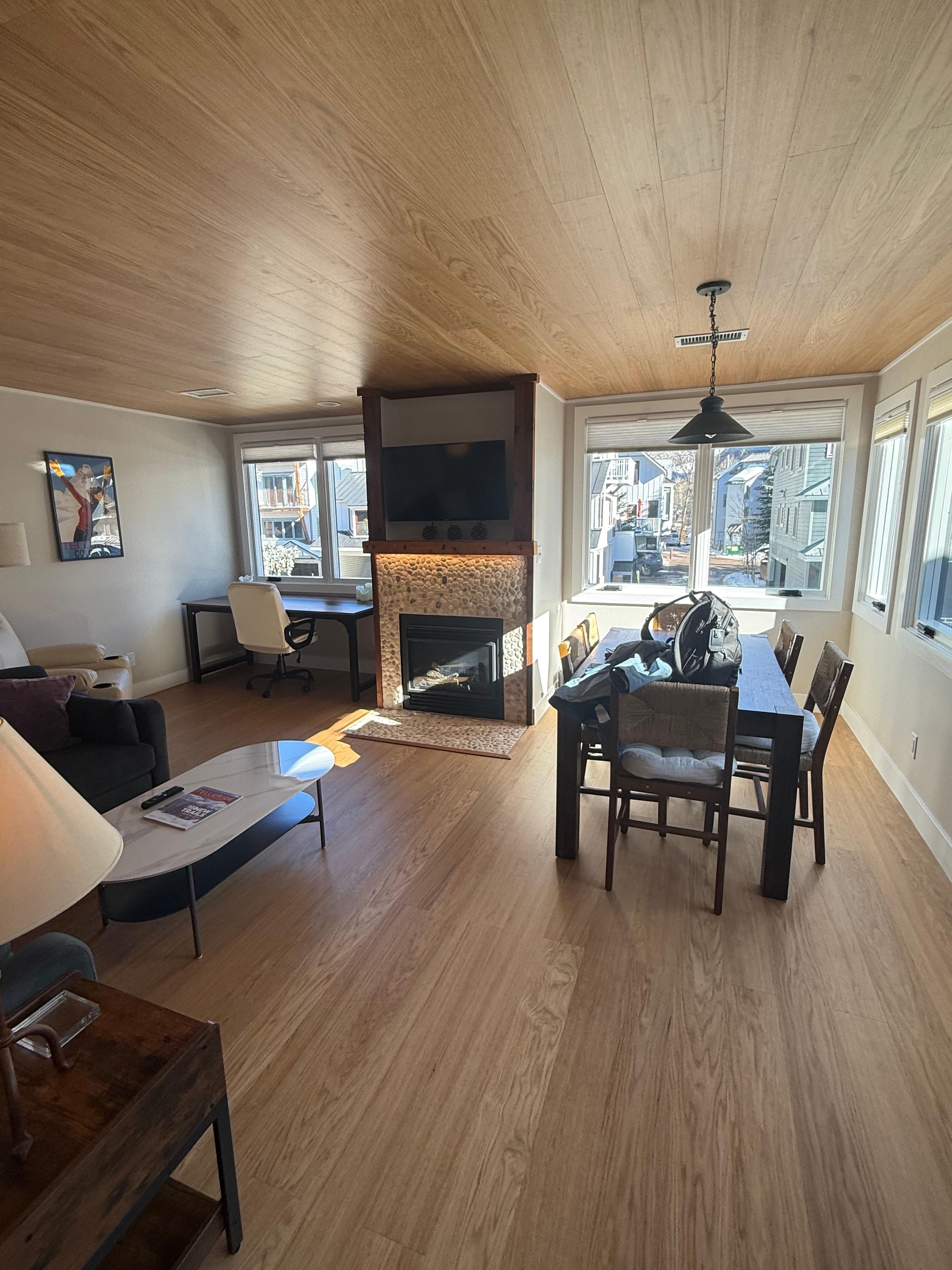 Step inside and you’ll find an inviting open floor plan with all-new finishes, a fully equipped designer kitchen, and thoughtful details throughout. The living area features warm wood tones, a gas fireplace, and abundant natural light pouring in through all new, large windows where you can enjoy views of the surrounding peaks including Ajax, the gondola and Needle rock.