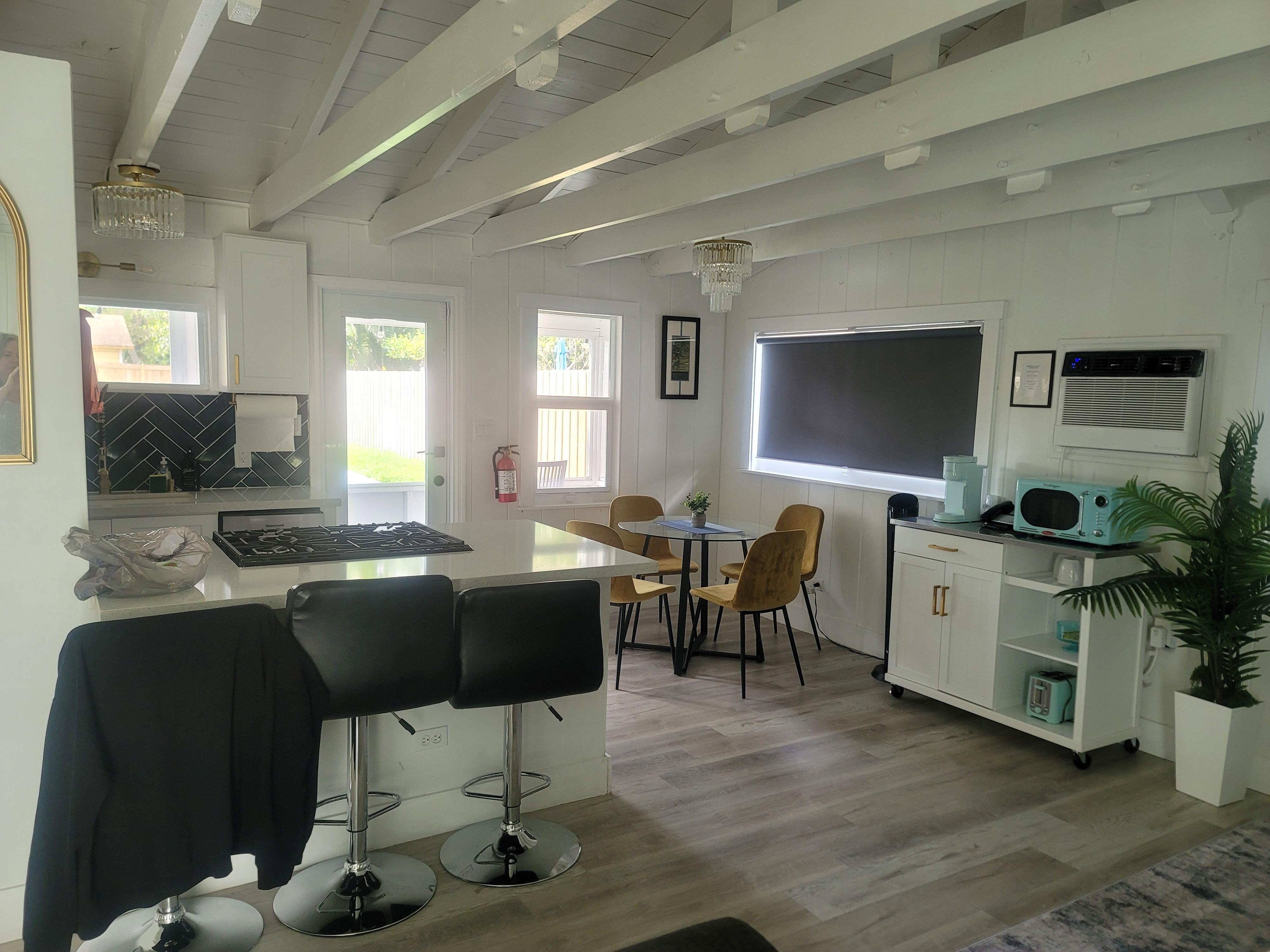 The house is cute as can be. It has original exposed wood ceilings that were painted white giving it a cottage beachy vibe. The high ceilings and open floor plan make it perfect!