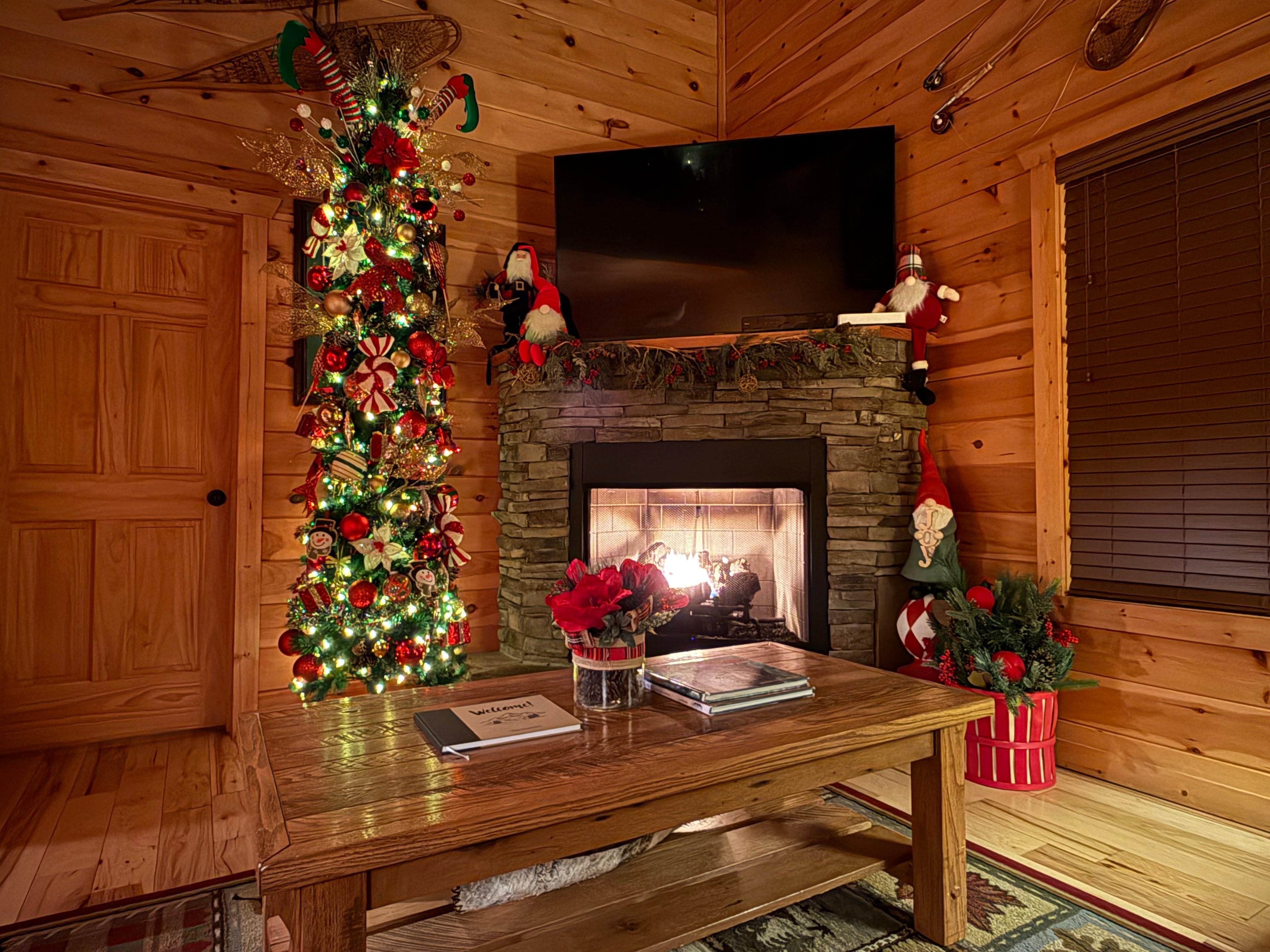 Entspannen Sie sich im Wohnzimmer mit einem 65-Zoll-TV, Ledercouch und Stuhl und einem Kamin aus Stein. Genießen Sie die Aussicht auf die Berge von jedem Niveau dieser Hütte. Sie können auch draußen auf der Terrasse sitzen und entspannen und einfach die friedliche Aussicht genießen.