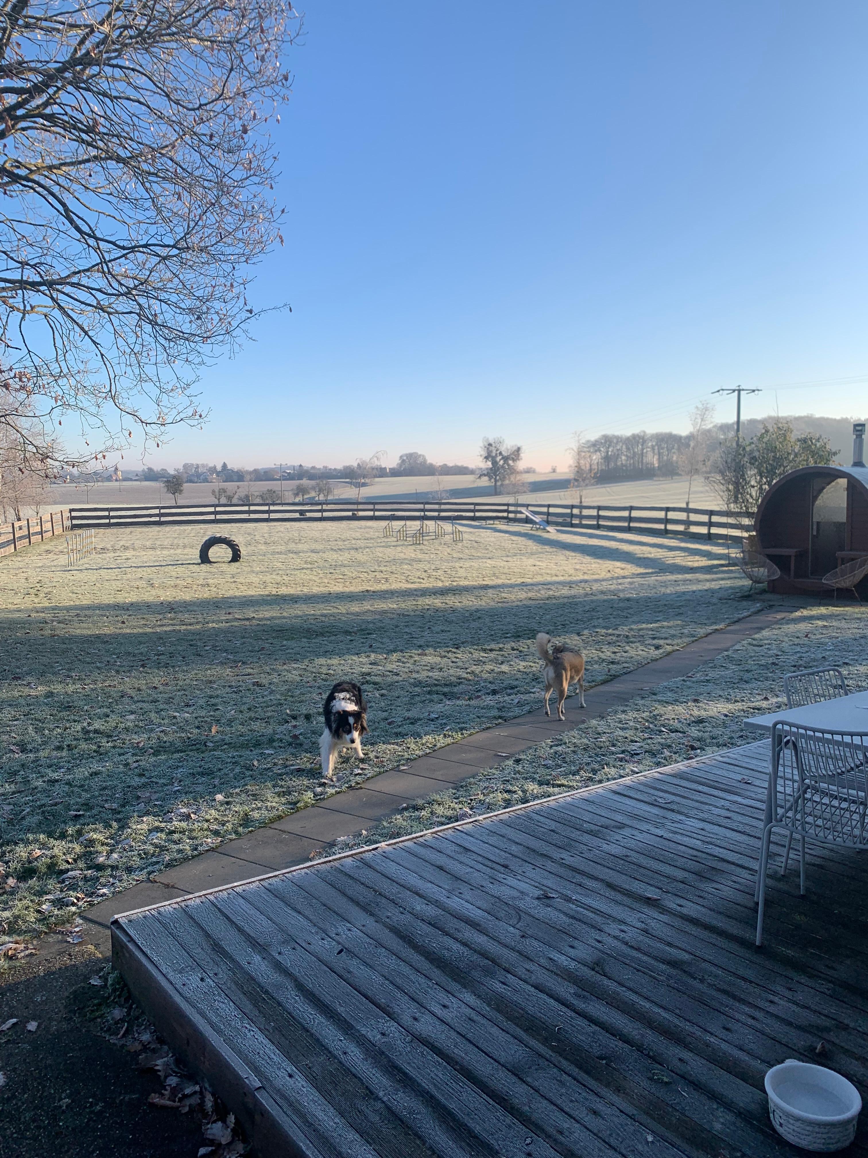 Das freistehende Ferienhaus steht auf 1600qm Gartenfläche. Davon sind 1200qm doppelt gesichert mit Lattenzaun & Drahtzaun, 1,2m hoch. Hier haben besonders Hunde und Ihre Menschen mit dem Agility-Parcours Spaß!