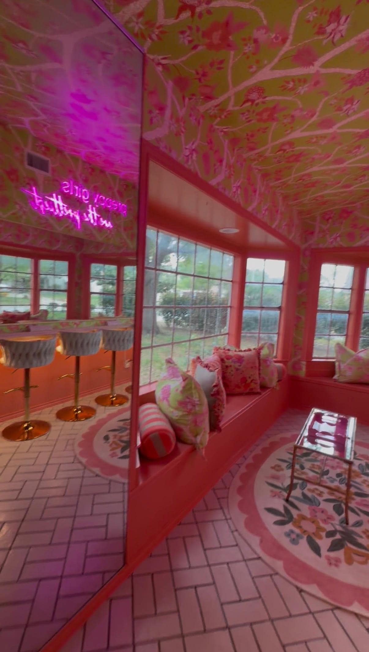 The Beauty Bar foyer sets the standard. Five velvet swivel stools, an oversized custom mirror, dedicated lighting, bay windows, built-in seating, and neon accents create a space where getting ready becomes part of the experience, not a bottleneck before it.