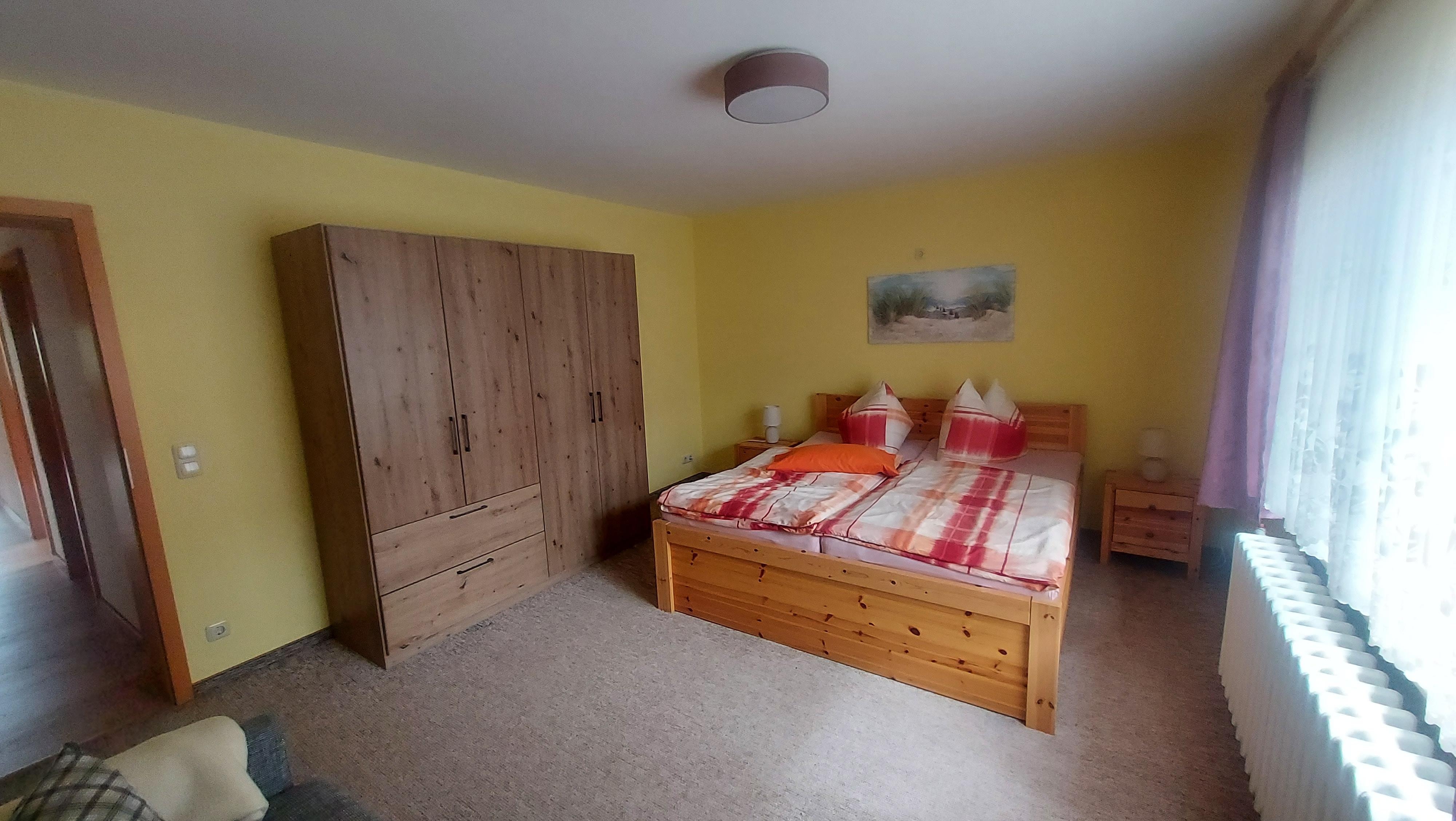Schlafzimmer (19qm) : Doppelbett, Nachttische, Schlafcouch/Bett „vollwertiges Bett“(Liegefläche ca..190x160cm), Kleiderschrank