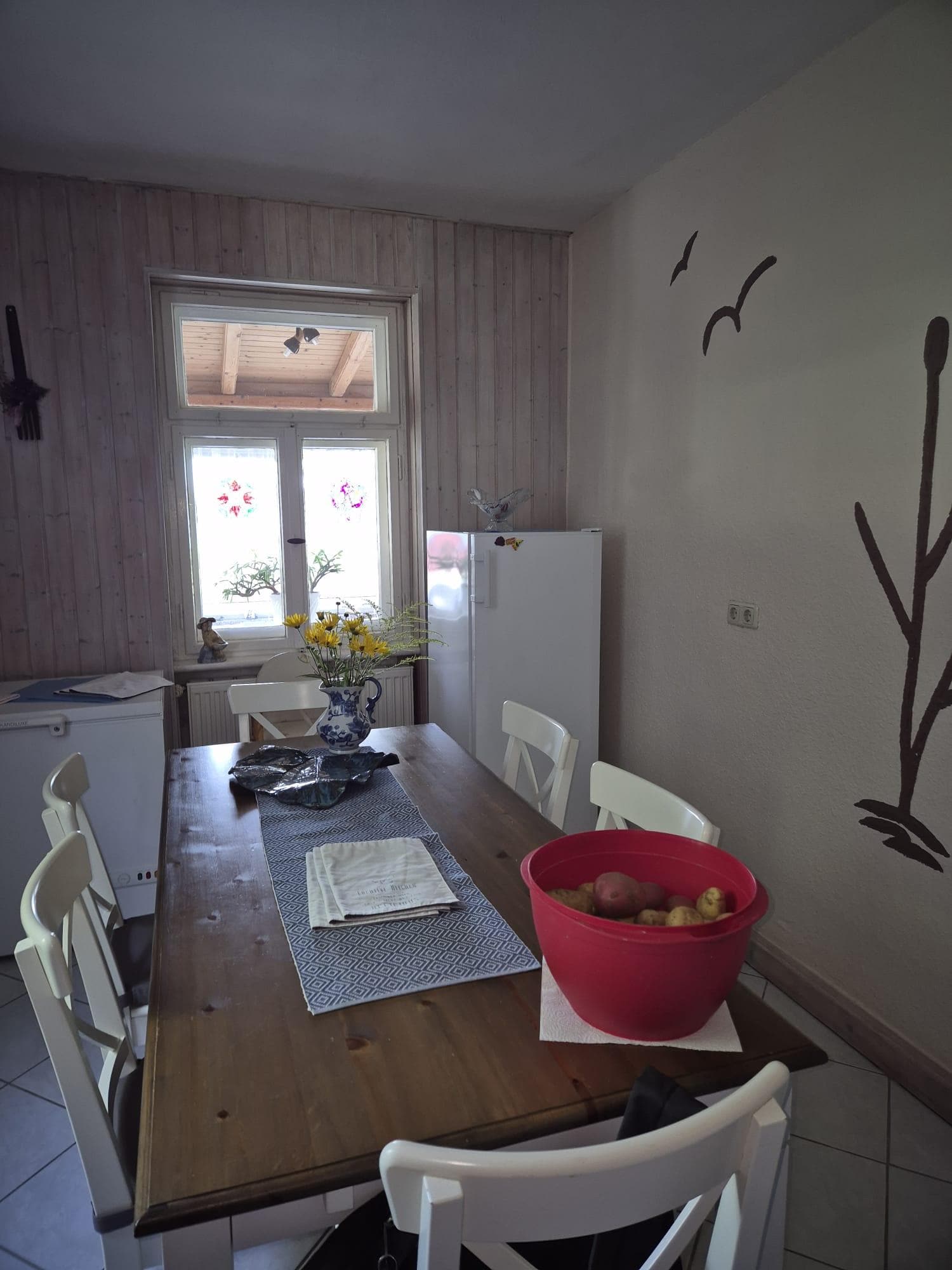 Eine große familienfreundliche Ferienwohnung für 5 Personen, Aufbettungen sind nach Absprache mit dem Vermieter möglich. Der großzügige Wohnraum bietet Ihnen Platz für gemütliche Abende vorm Fernseher. Hier können Sie auch WLAN nutzen. Auf dem Grundstück gibt es ein kleines Streichelgehege, bestehend aus Schafen, Esel, Hühner und Enten.Der Hafen, Schiffsanlieger und Einkaufsmöglichkeiten sind fußläufig und mit dem Fahhrad gut zu erreichen.