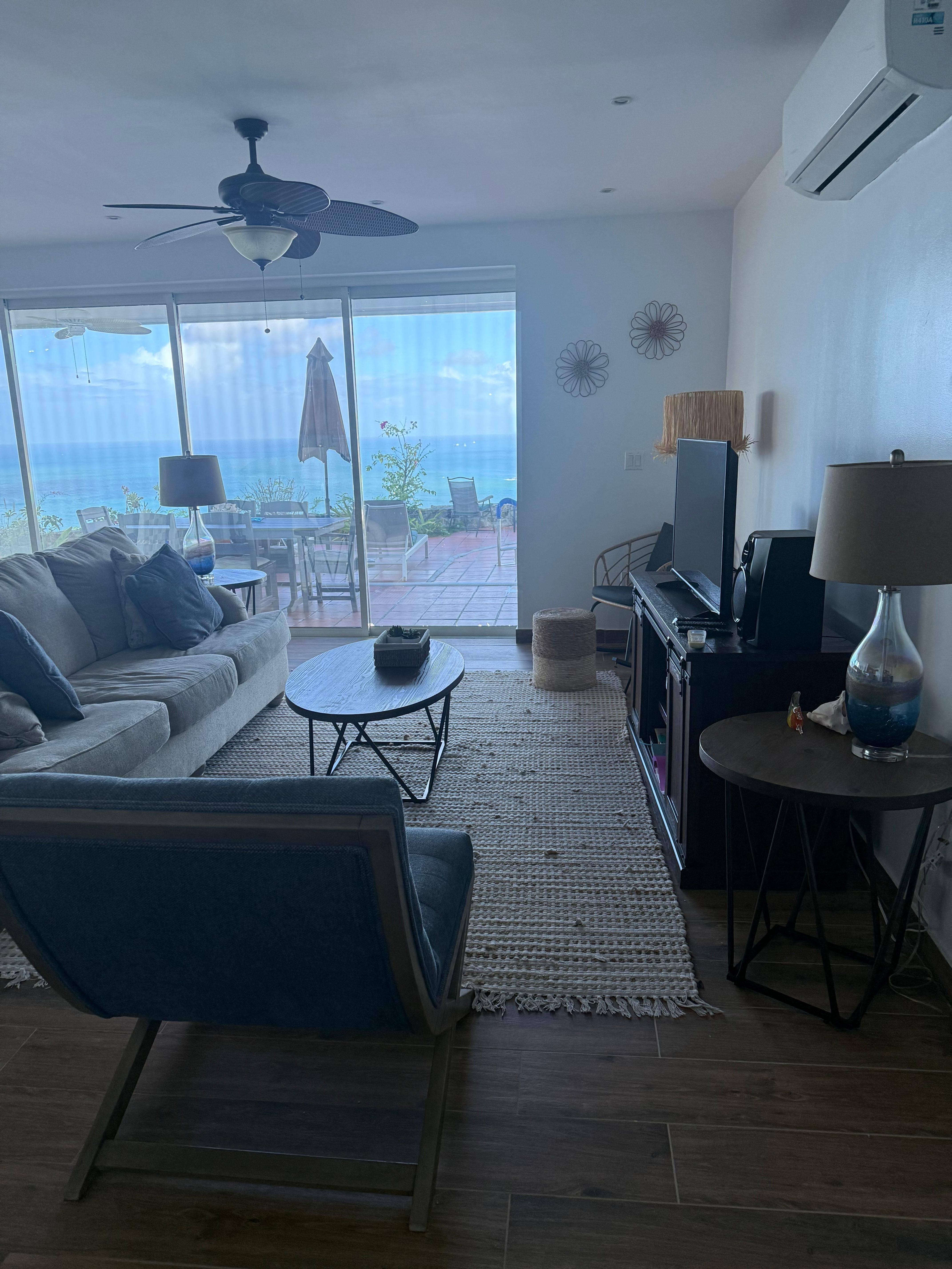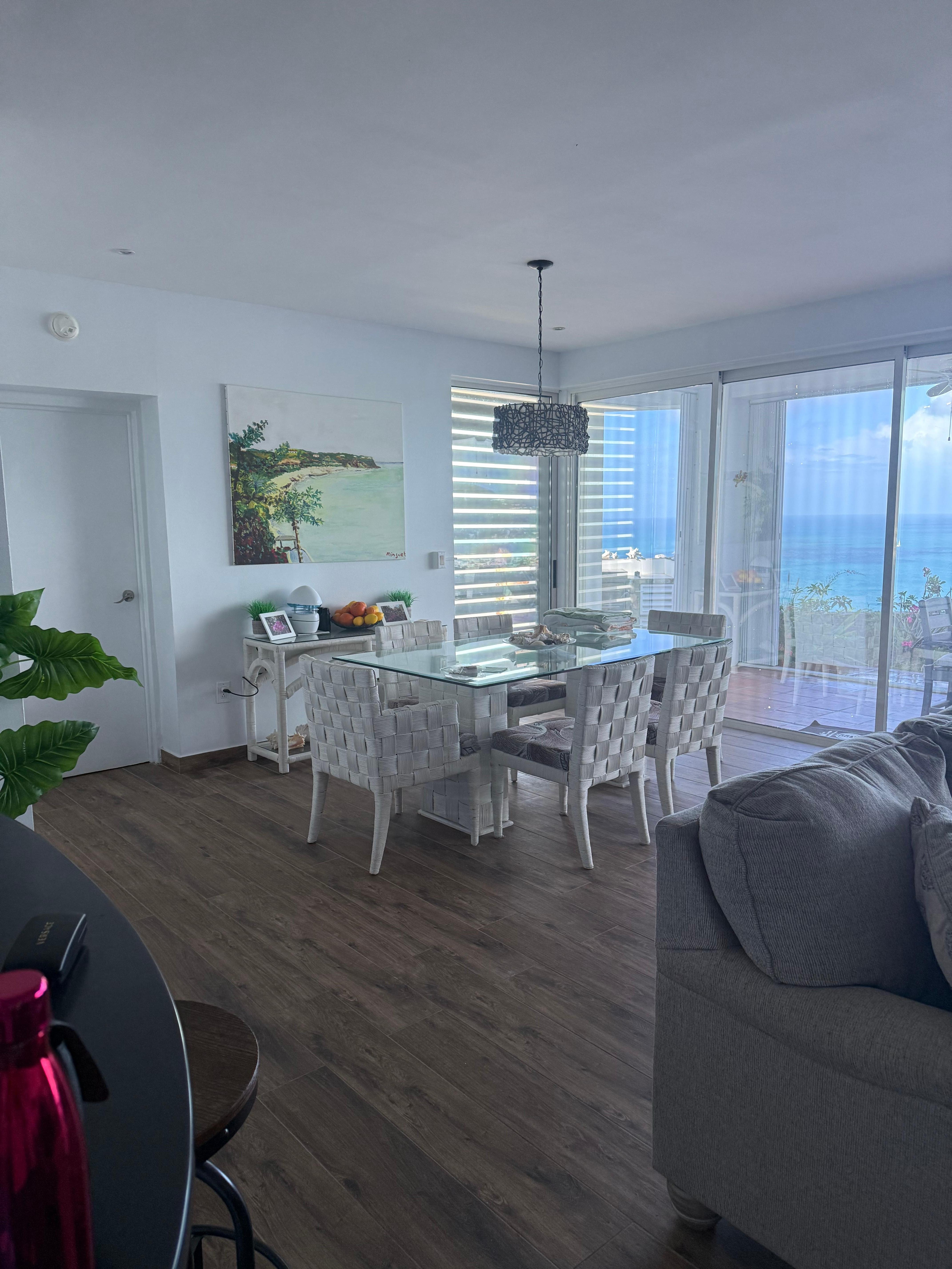 Eine Glasschiebewand im Wohnzimmer und im Esszimmer öffnet sich, um die Außenseite herein zu holen. Deckenventilatoren auf der Veranda und in jedem Zimmer bringen die karibische Brise herein. Jedes Schlafzimmer verfügt über eine separate Klimaanlage sowie das Wohnzimmer.