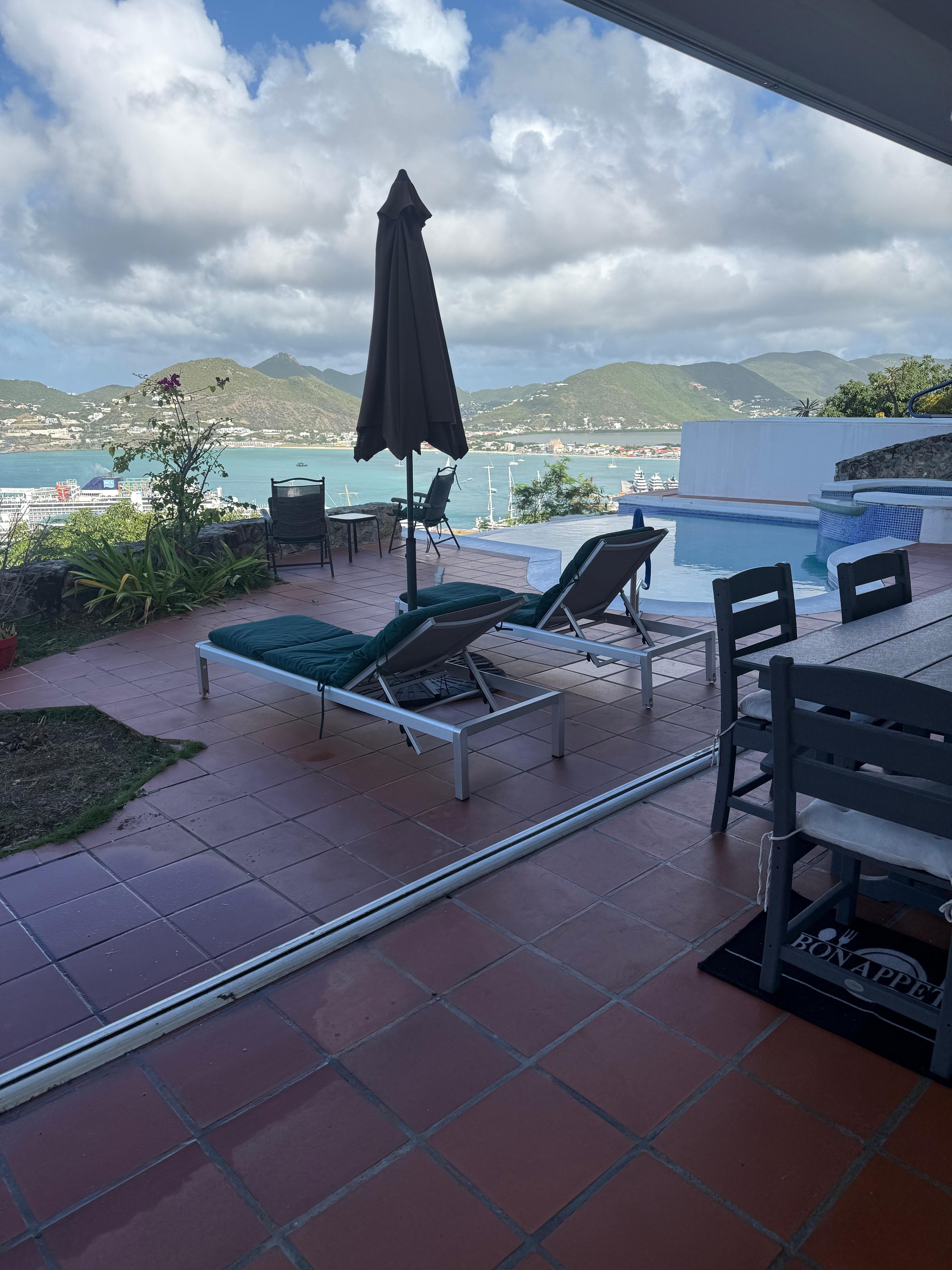 Vista Royale ist eine private Einheit mit 2 Schlafzimmern und 2 Bädern, die hoch auf dem Hügel mit Blick auf Phillipsburg und Great Bay liegt. Es befindet sich in Monte Vista, einer privaten Wohnanlage, die auf Privatsphäre und Sicherheit ausgelegt ist. Tagsüber können Sie am Pool sitzen und den Kreuzfahrtschiffen beim Einlaufen zusehen. Nachts können Sie die Veranda genießen und die herrlichen Sonnenuntergänge beobachten. Es gibt einen eingebauten Grill für Ihren Gebrauch.