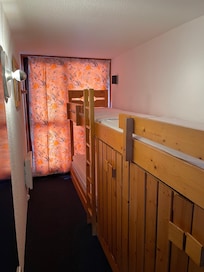 Nach Westen, in der Seiten Talboden (Eingangsebene Pisten Seite) befindet, hat eine Fläche von 34 m², verfügt über ein Schlafzimmer mit 2 Personen, gut ausgestattet mit Küche, einem Badezimmer mit Badewanne , ein Zimmer für 3 mit 2 Etagenbetten und separatem WC. Der Balkon bietet einen tollen Blick auf den Sonnenuntergang über dem Tal Isère.