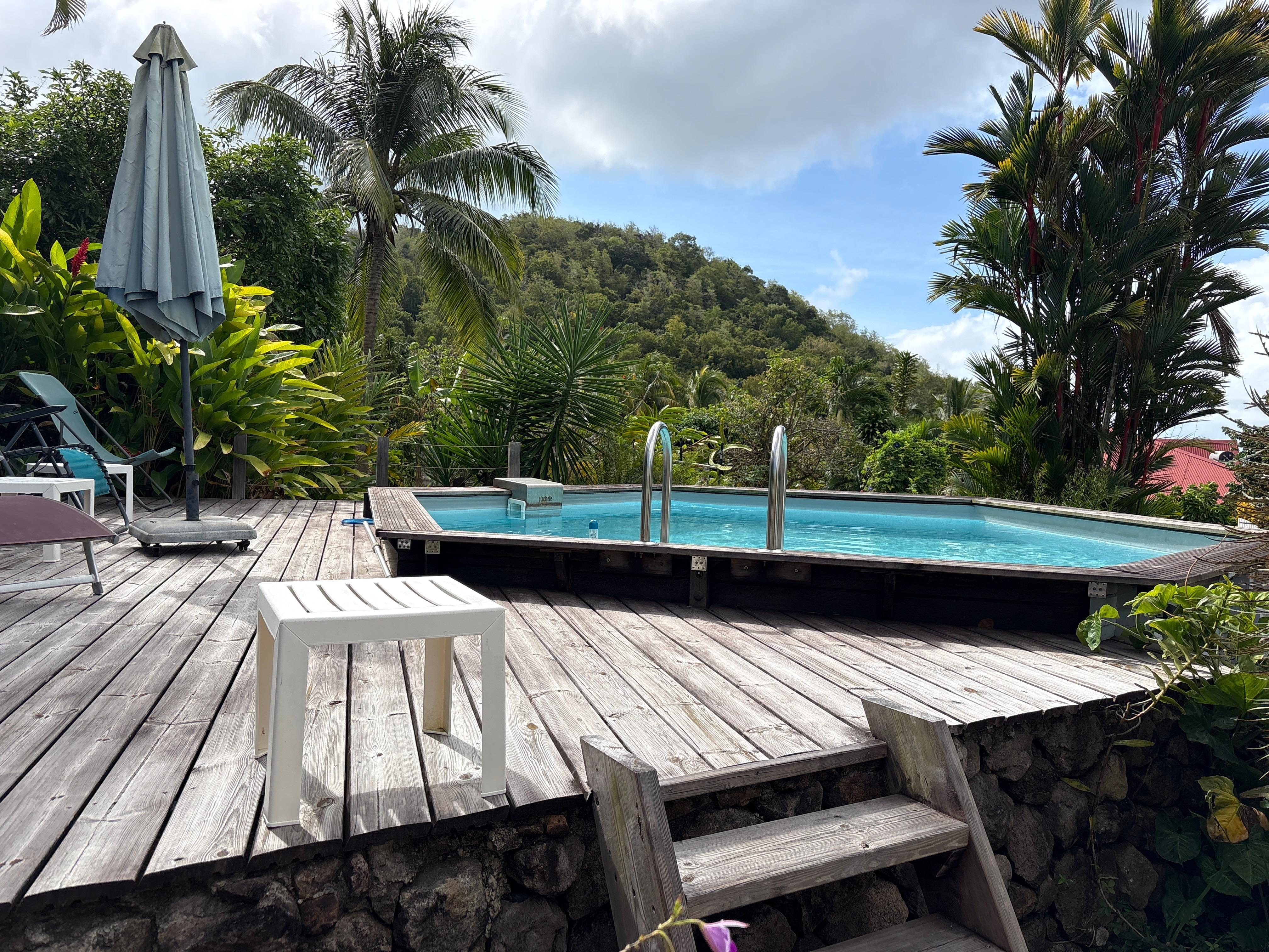 Die Wohnung befindet sich im Erdgeschoss einer Villa in einer ruhigen ländlichen Gegend, 3 km von den Stränden von Diamant und Anses d'Arlets entfernt. Es besteht aus einem Wohnzimmer / Küche und einem klimatisierten Schlafzimmer. Es hat eine Terrasse und einen separaten Eingang. Ihnen steht ein Garten mit Bäumen und Blumen sowie ein oberirdischer Pool zur Verfügung, von dem aus Sie den berühmten Felsen sehen können. Das erste Frühstück wird angeboten und der Eigentümer kann Ihnen eine Strandausrüstung ausleihen.