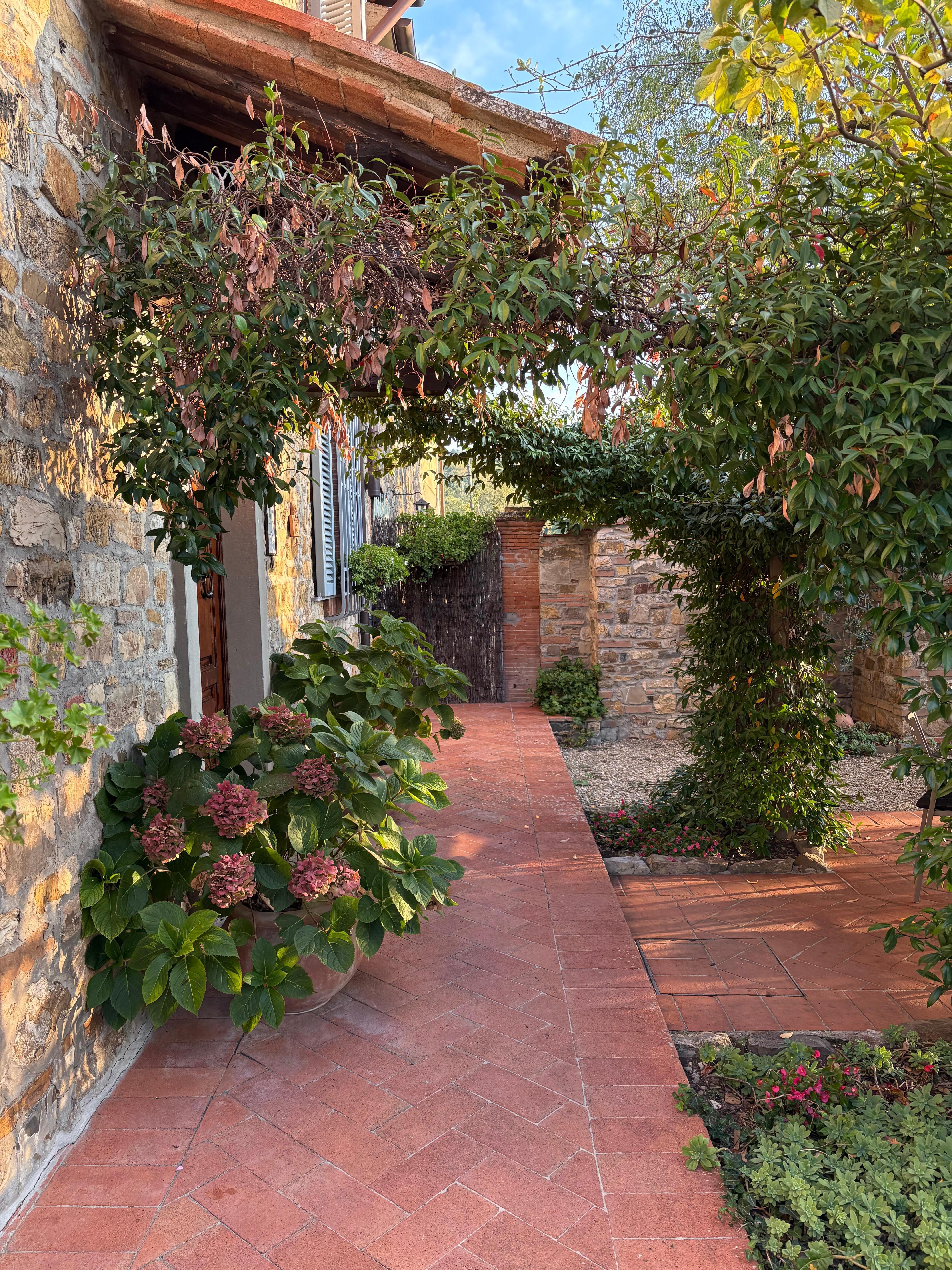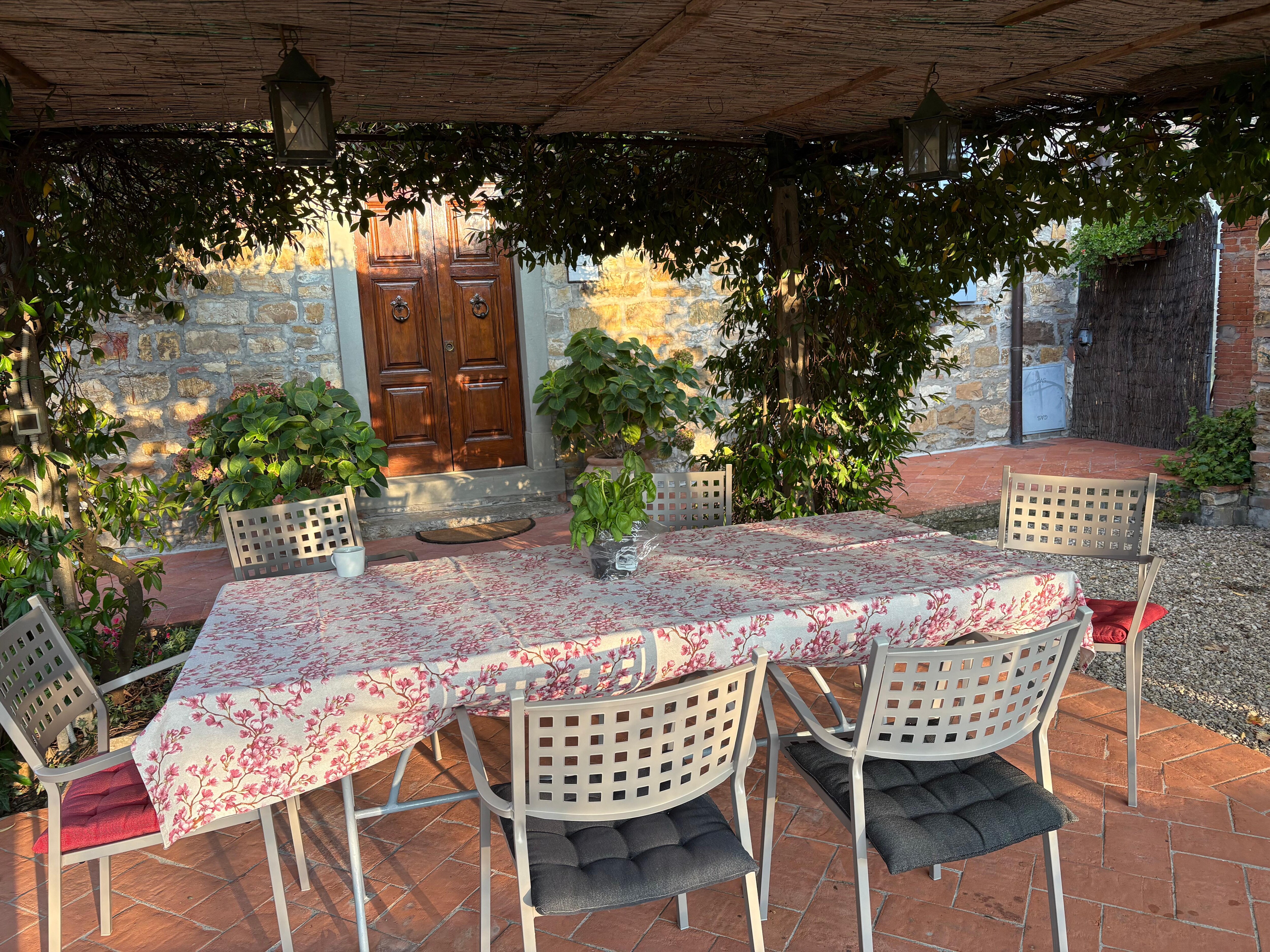 Casa Belmonte ist umgeben von einem Garten mit Olivenbäumen, Zypressen und blühenden Pflanzen und genießt einen herrlichen Blick auf die umliegenden Weinfelder. Direkt vor dem Haupteingang finden wir eine Pergola mit Tisch und Stühlen für gemütliche Essen im Freien sowie einen gemauerten Grill. Von hier aus schweift der Blick über die wunderschöne, typische Hügellandschaft. Etwas weiter unterhalb, jedoch ebenfalls in Panoramalage und über eine Freitreppe zu erreichen, befindet sich der private, 6x12 m große und 1,20-2,20 m tiefe, rechteckige Swimming-Pool mit römischer Treppe. Umgeben ist dieser von einer gepflasterten Sonnenterrasse mit Liegen, kalter Aussendusche und einem schattigen Pavillon mit Korb-Couchgarnitur und Tischtennis-Platte. Der Parkplatz befindet sich auf dem Grundstück. Innen