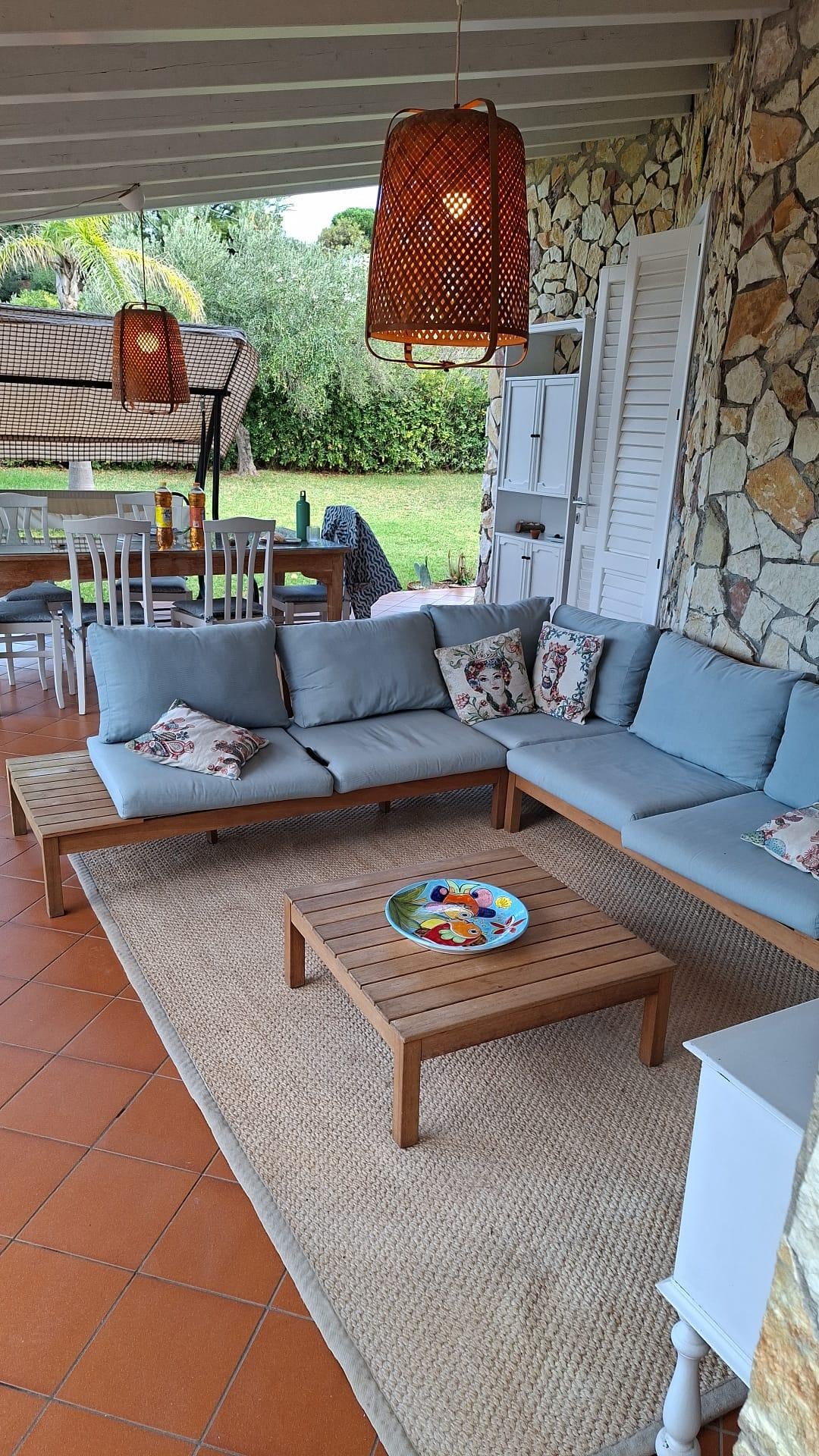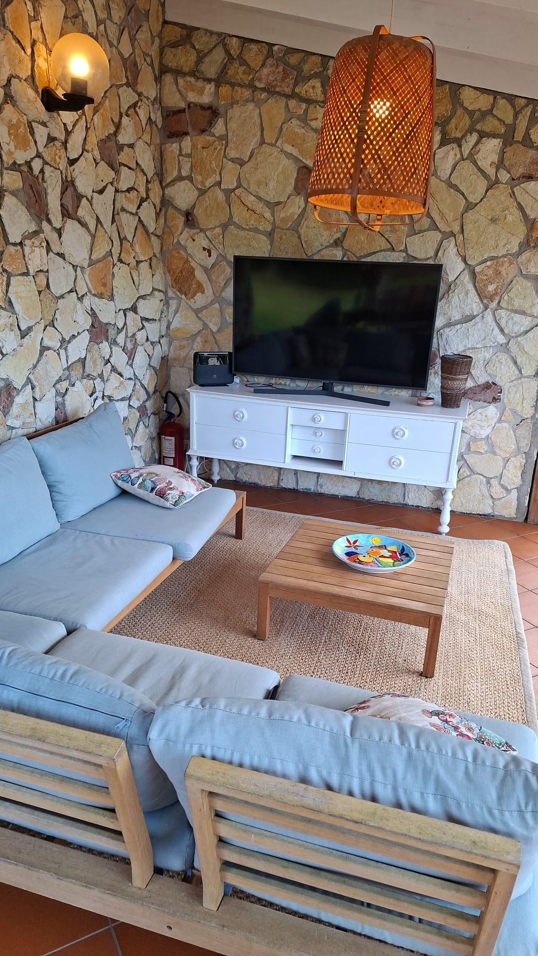 - Einzelzimmer (zwei Fenster mit Moskitonetzen und Eingangstür) mit Küche, Wohnzimmer, Doppelschlafsofa, 2 Schlafsesseln, Schließfach, Kommode, Holztisch mit zwei Stühlen, Klimaanlage; Toilette mit Dusche, Schuhablage und Handtuchhalter (Fenster mit Moskitonetz); Terrasse mit Pergola aus Holz, ausgestattet mit Rattan- und Glastisch, sechs Holzstühlen, Outdoor-Lounge, 2-Sitzer-Sofa, zwei kleinen Sesseln, zwei Holzliegen, TV P50 (wer mit einer Sky-Karte ausgestattet ist, kann sie so verwenden, wie sie ist vorhandener dedizierter Decoder).