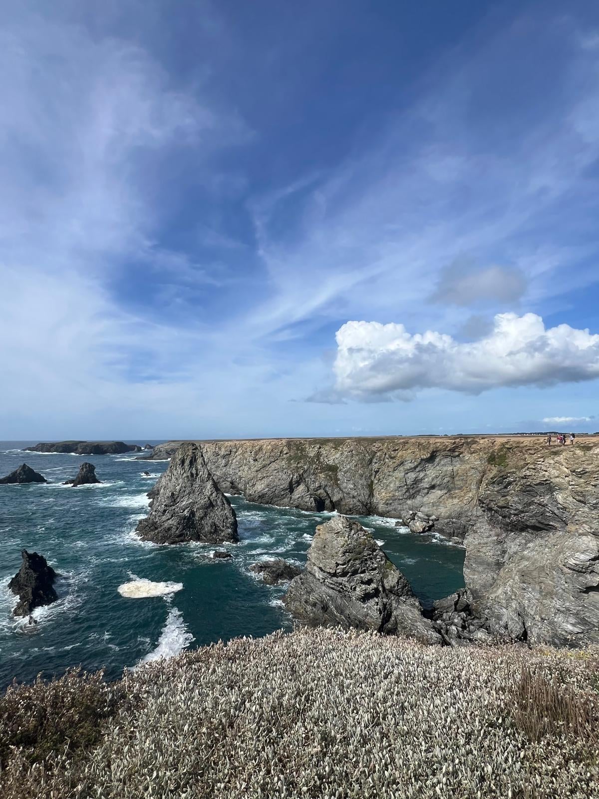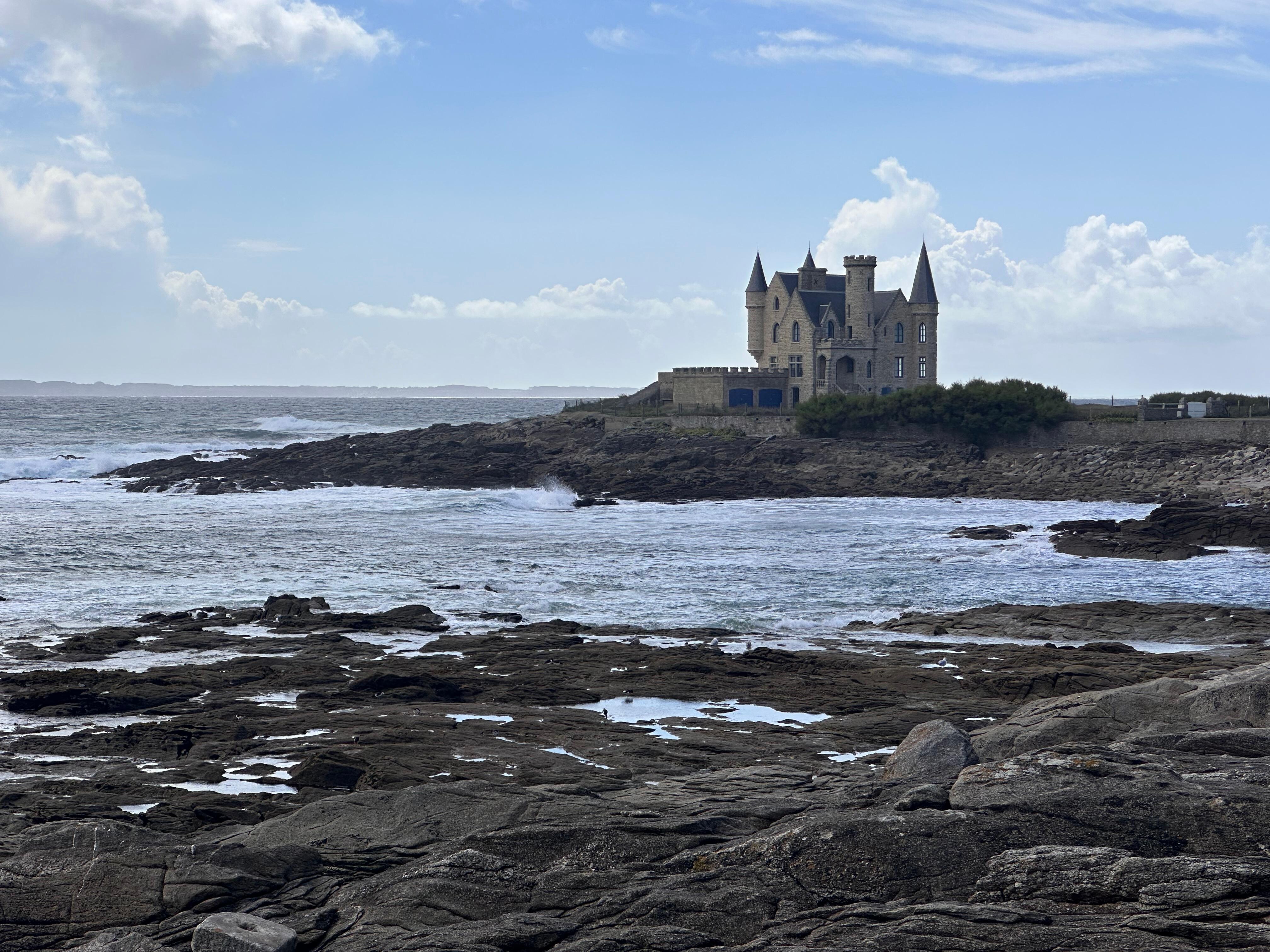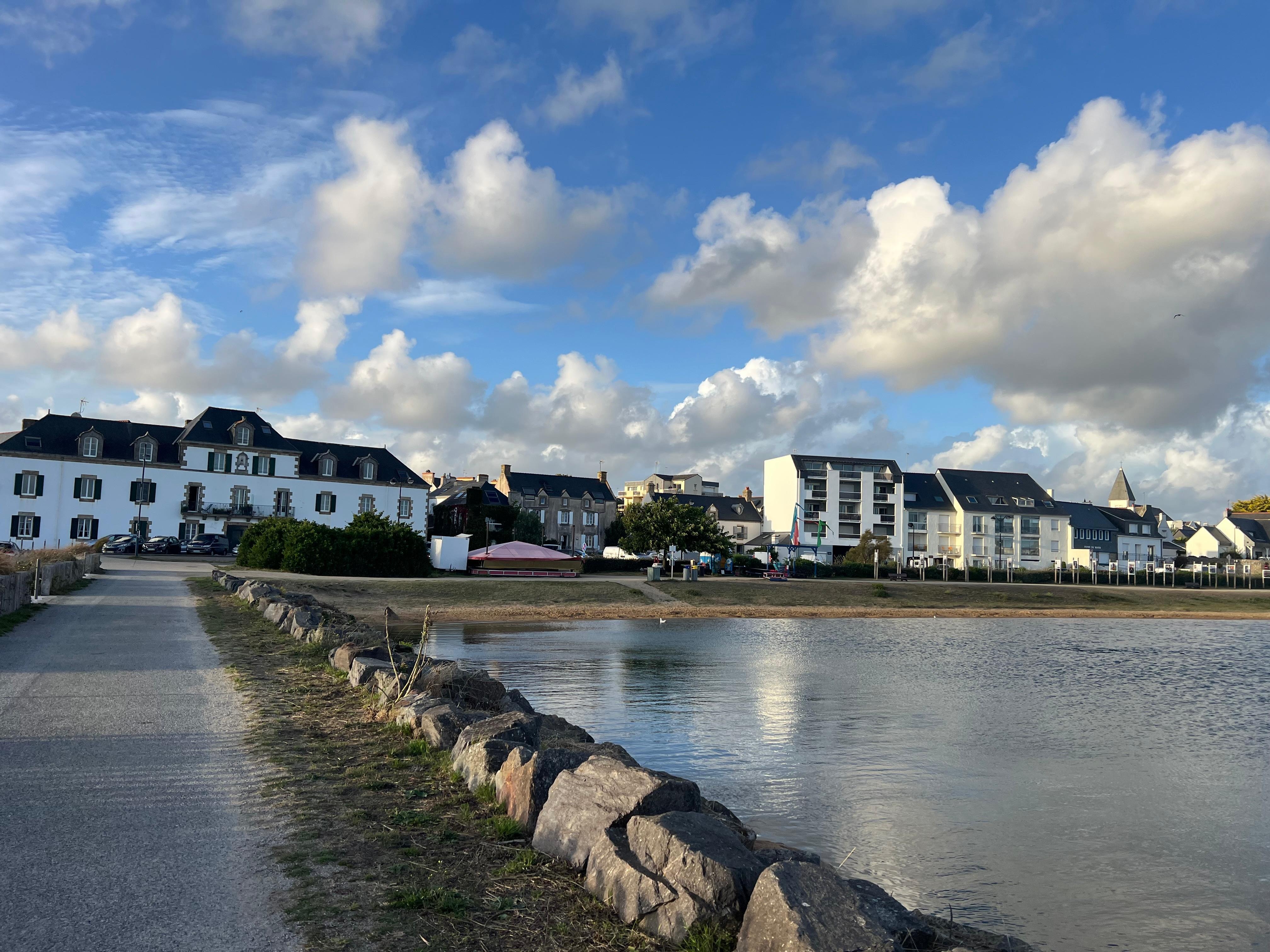 GroĂer Balkon mit herrlichem Blick auf das Etel bar und das offene Meer auf die Insel Groix mit Tisch, StĂŒhlen und Sonne.